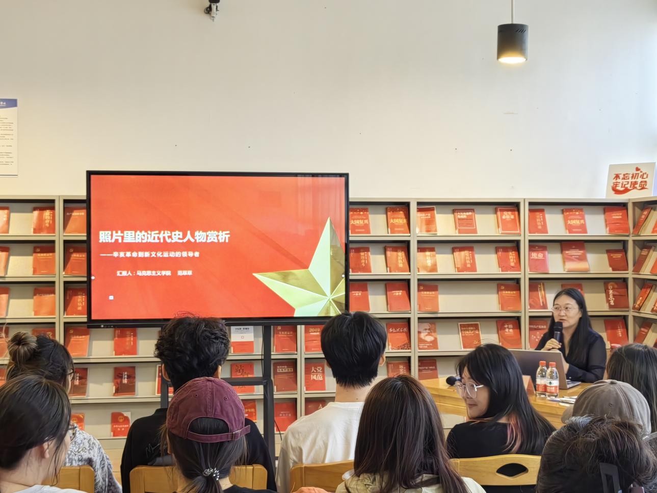 11月15日下午5:00,范翠翠老师在图书馆三楼“红色阅读角”举办红色知识专题讲座,本期讲座的主题是照片里的近代史人物赏析!设计学院的积极分子到场聆听讲座并参与互动,氛围良好,同学们纷纷表示受益匪浅。(张家梅摄)