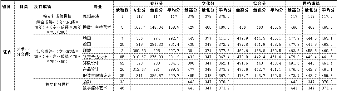 2020年江西 艺术类录取情况