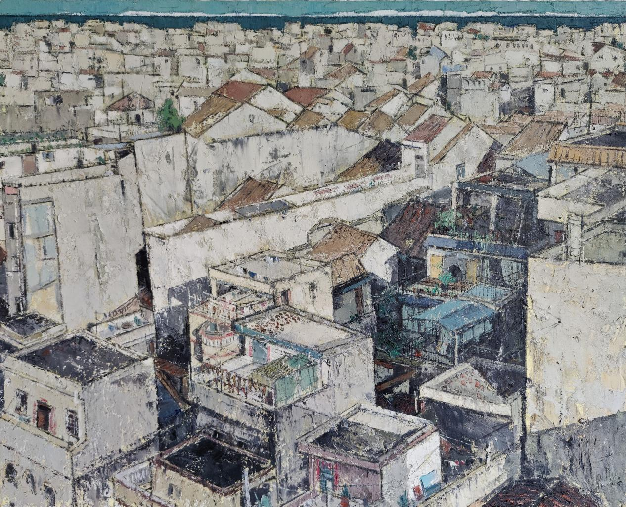 油画作品《那片海》以广西北海老街为创作素材,生动描绘了海边百年骑楼建筑群的独特风貌,远处碧海蓝天与近处沧桑老楼形成时空对话,通过厚重的油彩肌理和温暖的色调,既展现了骑楼建筑中西合璧的特色,又传递出北海作为海上丝绸之路重要港口的悠久历史韵味。