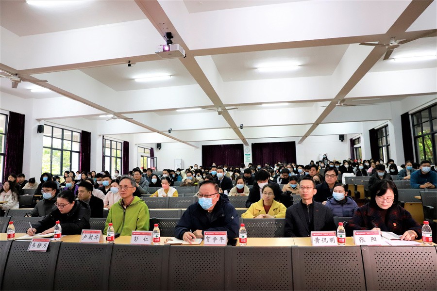 全体在校党政领导、中层干部、党员代表、思政课教师代表、专职辅导员代表、学生团员代表聆听宣讲。(周小琪/摄)