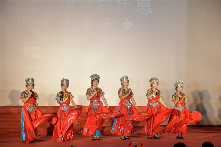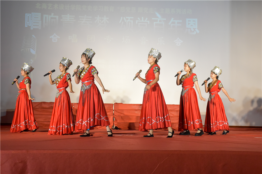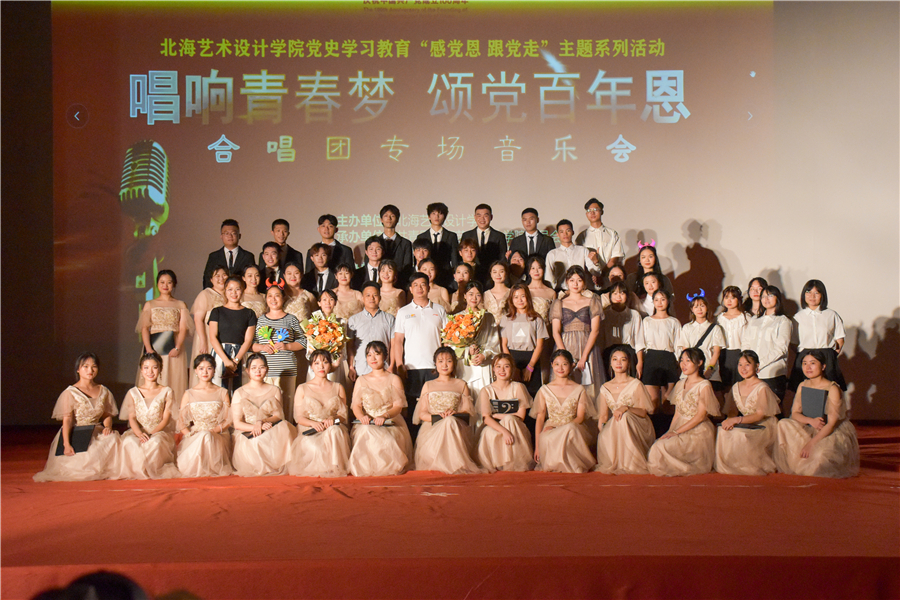在庆祝中国共产党成立100周年之际,进一步推动党史学习教育入脑入心、走深走实,6月19日晚,北海艺术设计学院党史学习教育“知恩党 跟党走”主题系列活动“唱响青春梦 颂党百年恩”合唱团专场音乐会在西校区礼堂举行。北艺学子深情唱响百年征程上一曲曲辉煌的动人诗篇,用艺术的感染力和影响力凝聚起高校师生奋进新征程的磅礴力量。本次音乐会共分为《青春之鸣》《乡族之音》《颂党之歌》三个篇章,嘹亮的雄歌唱起,红色的党旗飘扬。