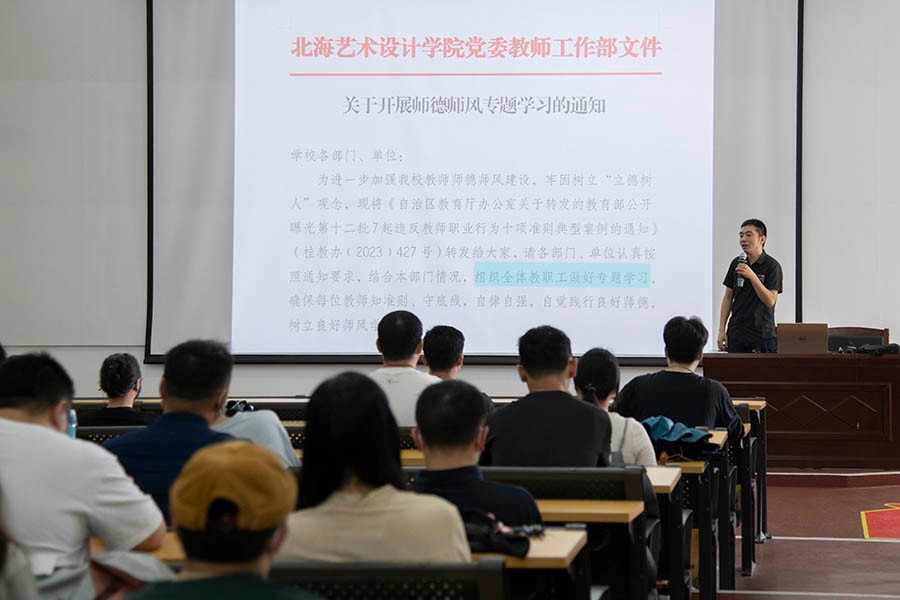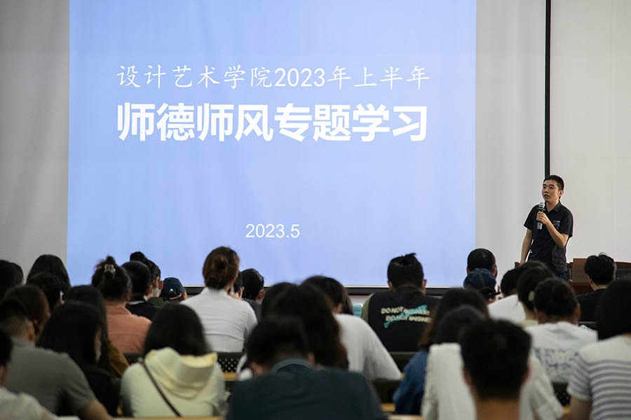 5月26日上午,设计艺术学院召开2023年上半年师德师风专题学习会,由党总支书记黄锦领学,学院全体教职工参加。