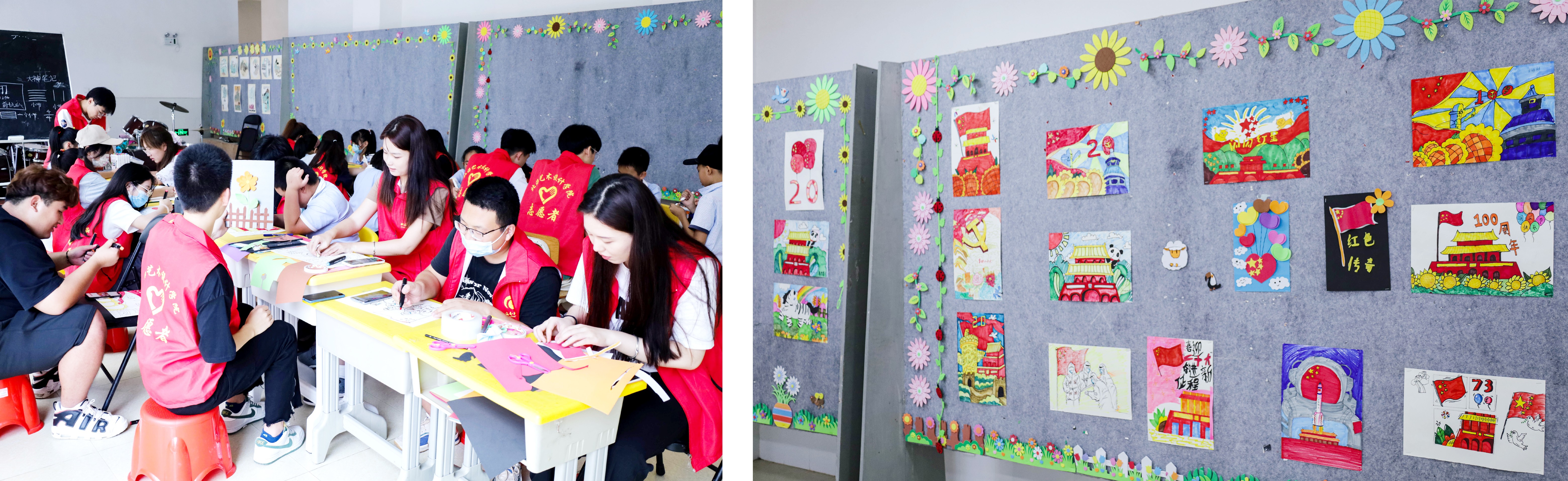 本次活动由建筑与环境艺术学院青年志愿者协会主办,其主题为“学习二十大、永远跟党走、奋进新征程、描绘中国红”。志愿者们根据安排到达指定教室,对学生展开教学活动,同学们在课堂上展开想象的翅膀,确定画画的内容,并在志愿者们的帮助下进行排版、定稿和上色。在活动期间,同学们和志愿者们共同探讨、发挥想象、教学相长,用不同的思维方式与独特的绘画语言,创造出独属于自己的祖国献礼。活动结束后,学生和志愿者们一起将自己的作品粘贴到宣传栏,并介绍自己作品的含义,表达对祖国妈妈的美好祝愿。