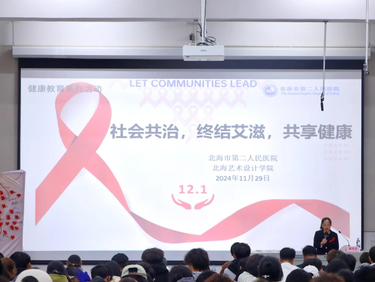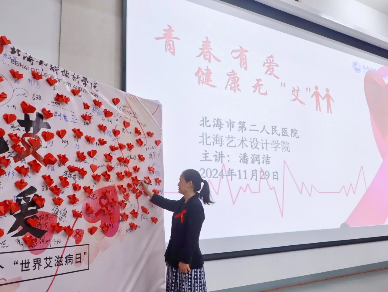 为进一步加大防艾宣传力度,提升我校师生对艾滋病的认识和防护,2024年11月29日,我校于西区公德楼107开展“青春有爱·健康无艾”的性与生殖健康、女性生理健康、防艾禁毒主题讲座。为此特邀北海市科学传播医疗卫生专家,北海市第二人民医院的潘润洁老师围绕主题“社会共治,终结艾滋,共享健康”探讨艾滋病相关知识与防治要点。