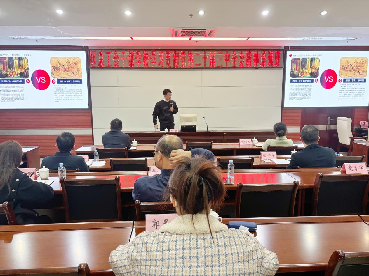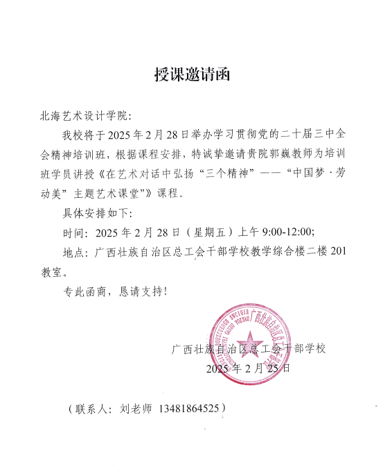 2025 年 2 月 28 日,我校工会副主席、青年教师郭巍受邀赴广西壮族自治区总工会干部学校,为其全体教师 学习贯彻党的二十届三中全会精神培训班” 作专题讲座,讲座主题为《在艺术对话中弘扬 “三个精神”——“中国梦・劳动美” 主题艺术课堂》。