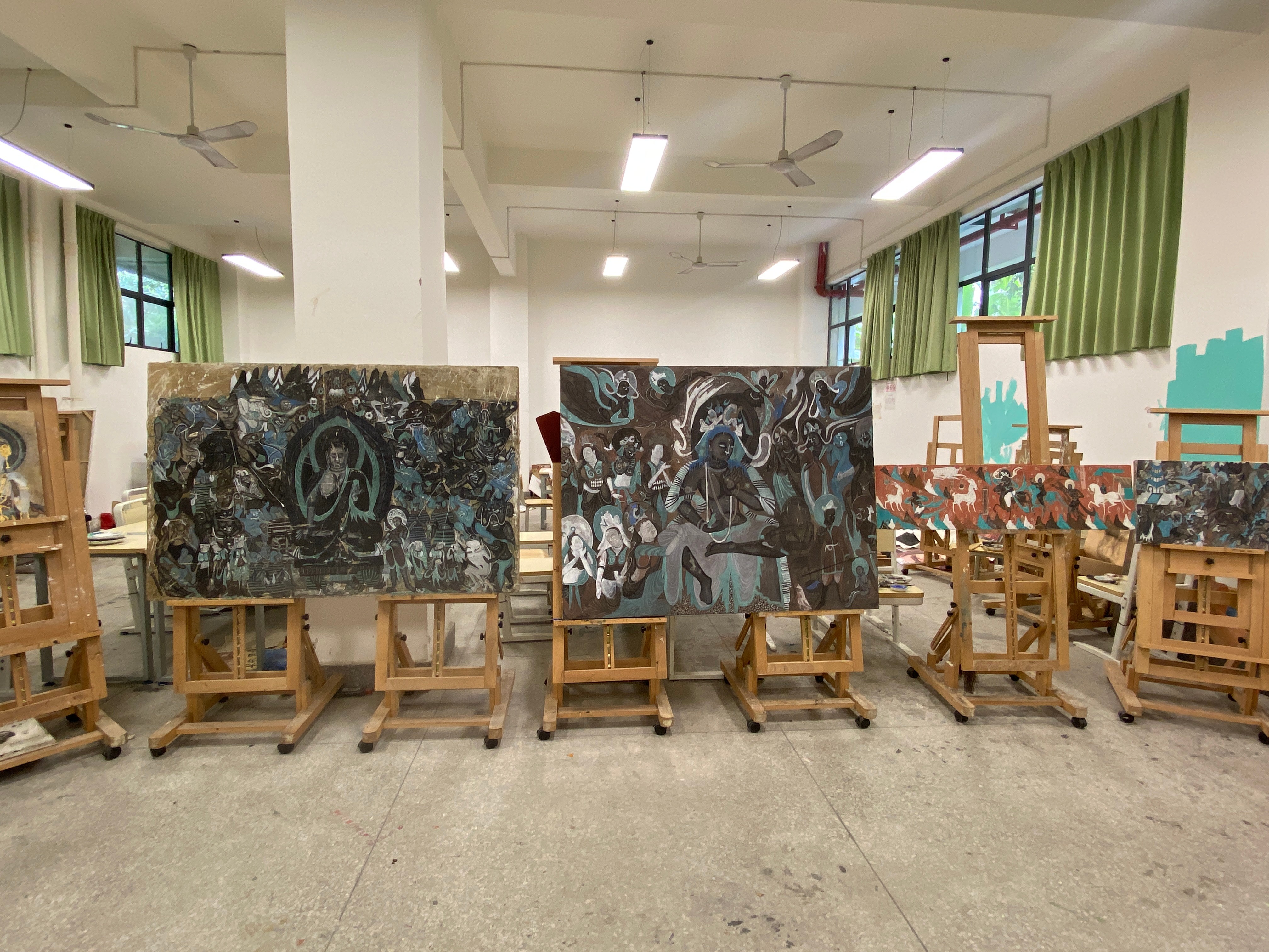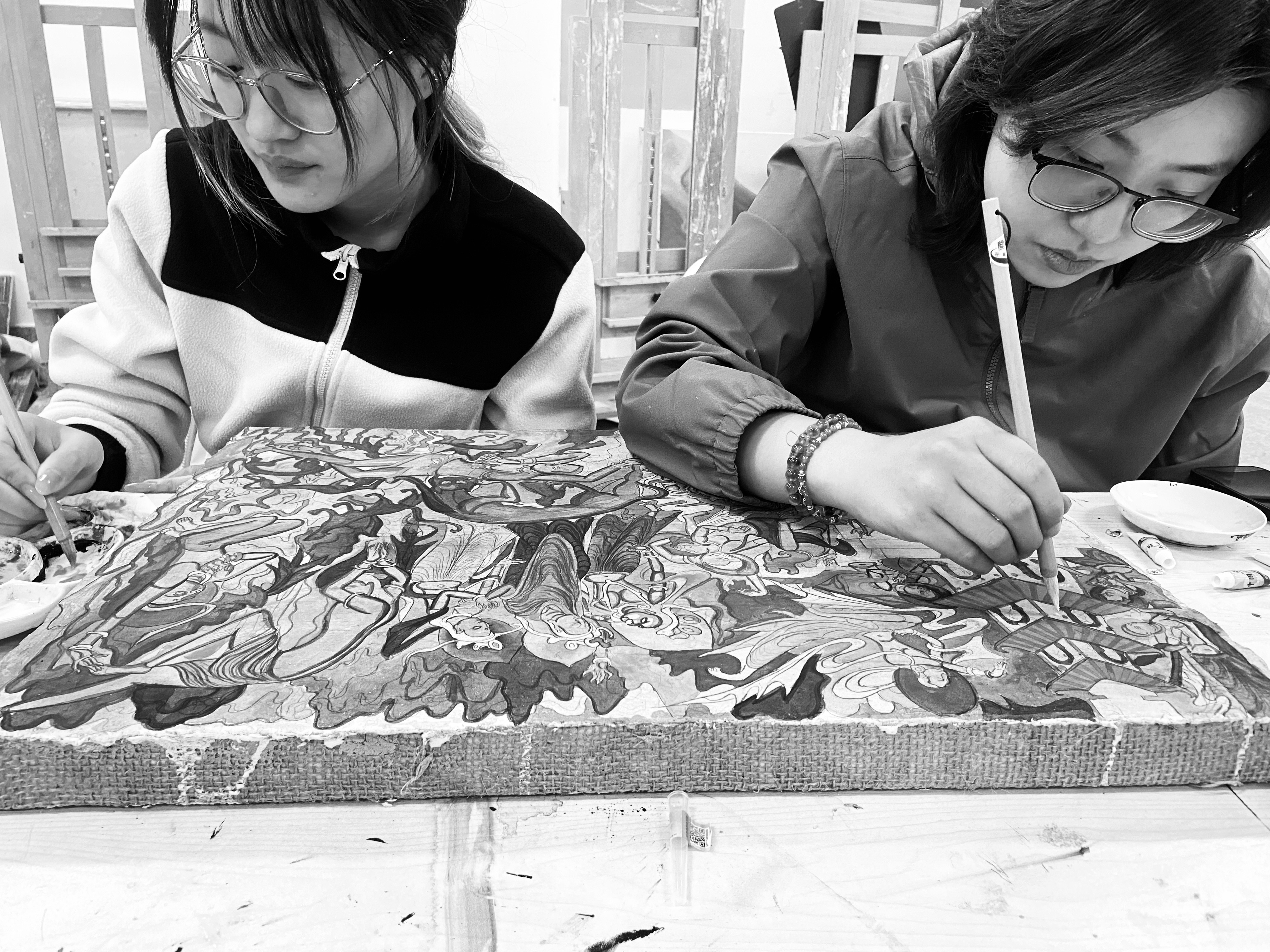 《中国传统壁画临摹》是面向美术学院学生的专业拓展课,以理论和实践相结合的方式,初步认识敦煌壁画的经典遗存。课程从莫高窟的历史背景、文化内涵和壁画故事文本的梳理,在理论上对敦煌壁画构建出一个立体的认识。要求学生绘制中严格按照传统壁画的绘制流程,体会古代画师对壁画工艺的尊重与严谨。建议学生按小组结合完成整铺壁画的临摹,感受壁画独特的图像叙事逻辑,也可个人选取局部进行现状临摹。临摹过程中体会矿物材料的特性、美感,并分析经过时间洗礼后的壁画色彩的承接关系等。鼓励来自不同专业的同学发挥自身艺术能动性,在实践中体会传统壁画与本专业绘画的异同,激发自身的创造性,为日后的创作提供更多的可能性。