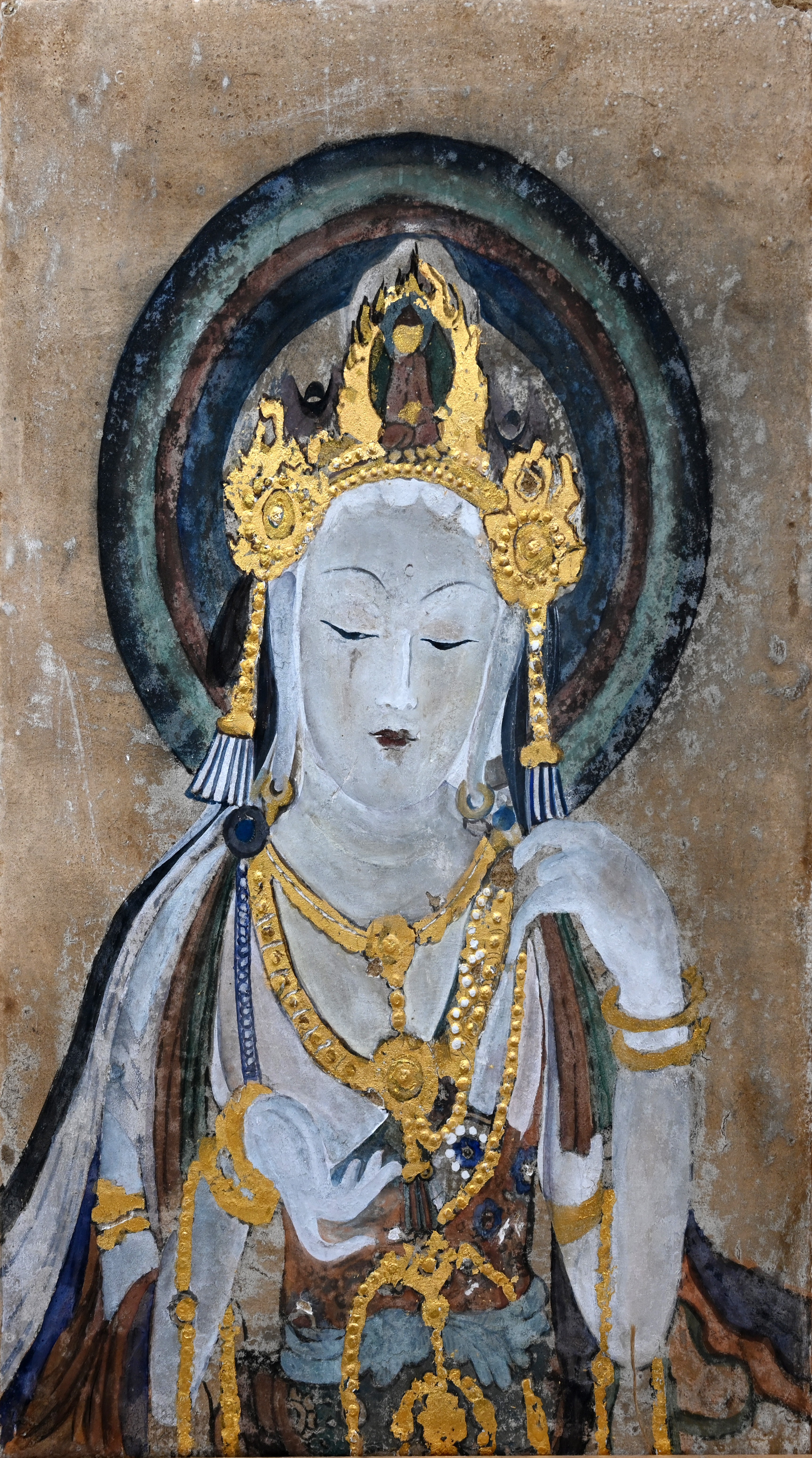 我的专业是水彩。水彩使用水溶性颜料,以水作为媒介,颜料的透明度较高;与中国画有所不同,中国传统壁画则是使用天然矿物色以及水干色颜料,相比水彩更加厚重。水彩的主要技法有:干画法、湿画法、干湿画法相结合,通过笔中水的多少来把握颜色的深浅;中国传统壁画则是先打底稿、再勾线、后画墨稿、最后上色。而敦煌莫高窟在经历了自然灾害后所呈现出的历史的破旧感,与水彩恰好有相似之处。通过这门课程的学习,我发现可以把中国传统壁画的表现方式运用到水彩之中,创新绘画方式,实现多种绘画方式的融合,给我日后的创作带来了全新的视角以及思路。