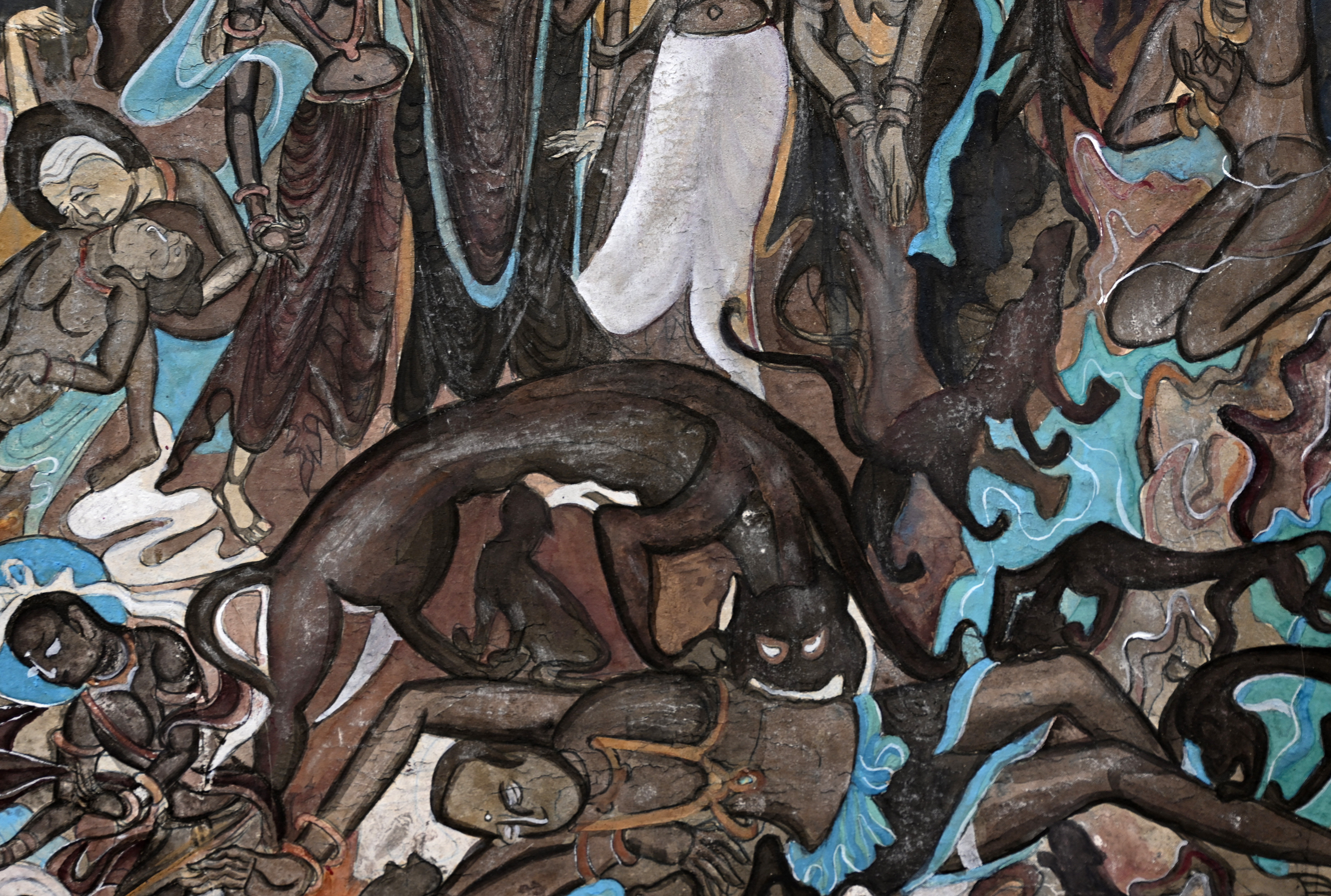 我们小组临摹的是敦煌莫高窟24窟的《割肉贸鹰》,本生故事,该幅壁画表现了尸毗王的功德,以及自我牺牲精神。与多见的单线型叙事逻辑不同,敦煌莫高窟打破了时间与空间,用“切片”等方式,一个图像表示着一个时间发生运动着的时空。