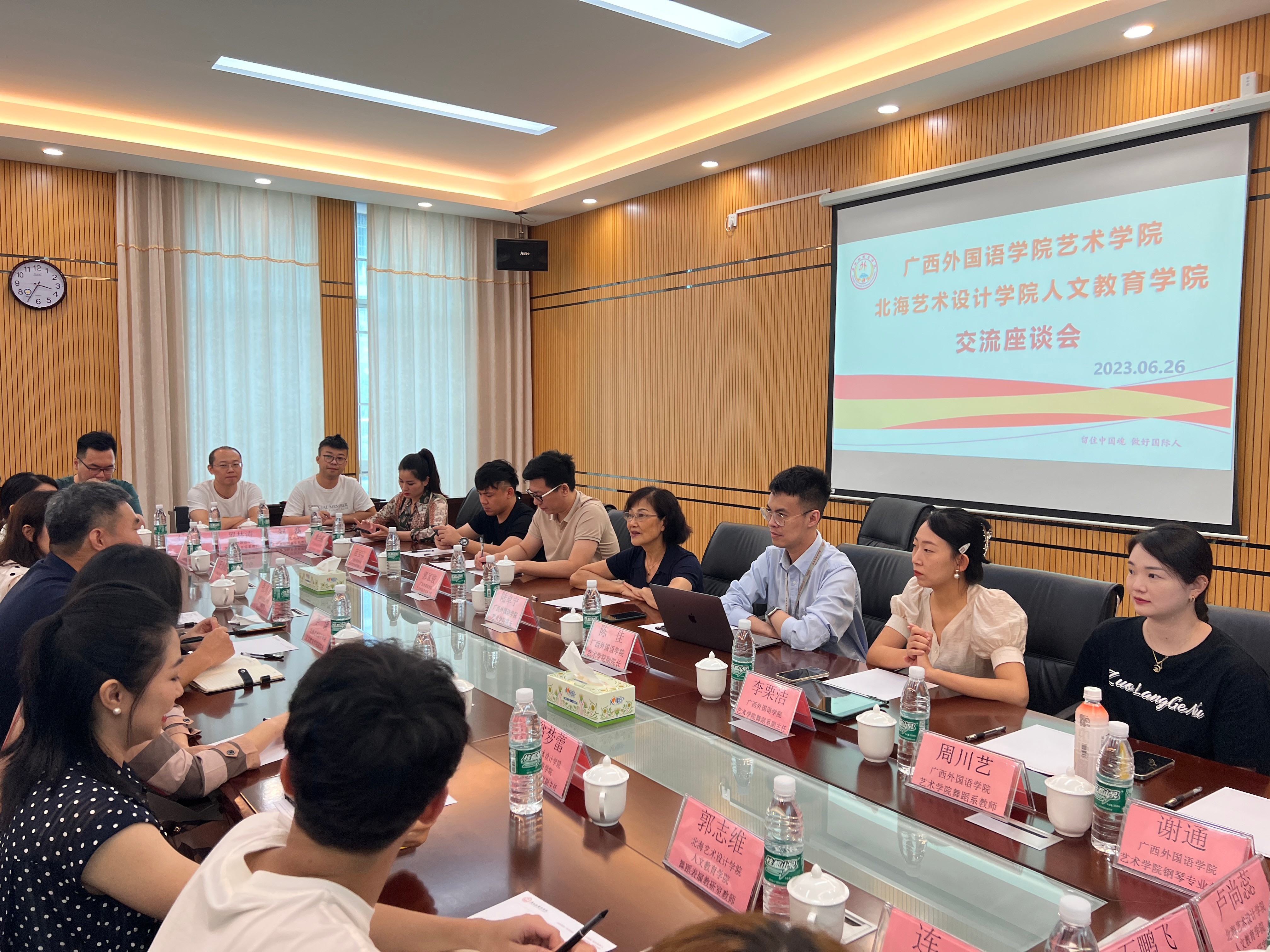 广西外国语学院艺术学院院长陆卓宁、副院长陈佳、舞蹈系、音乐系主任、乐团、合唱团负责人及骨干教师出席会议。陆卓宁院长对我校一行的到访表示热烈的欢迎,并详细的介绍了广西外国语学院艺术学院发展历程、办学成果、专业建设、人才培养方案制定等方面的基本情况。双方先后就学院规模、发展建设历程、建制、评估工作等情况进行了热烈的交流,并对我校申办音乐新专业以及舞蹈表演专业现有的课程建设、课程体系、实践教学、人才培养方案等内容进行了深入探讨。
