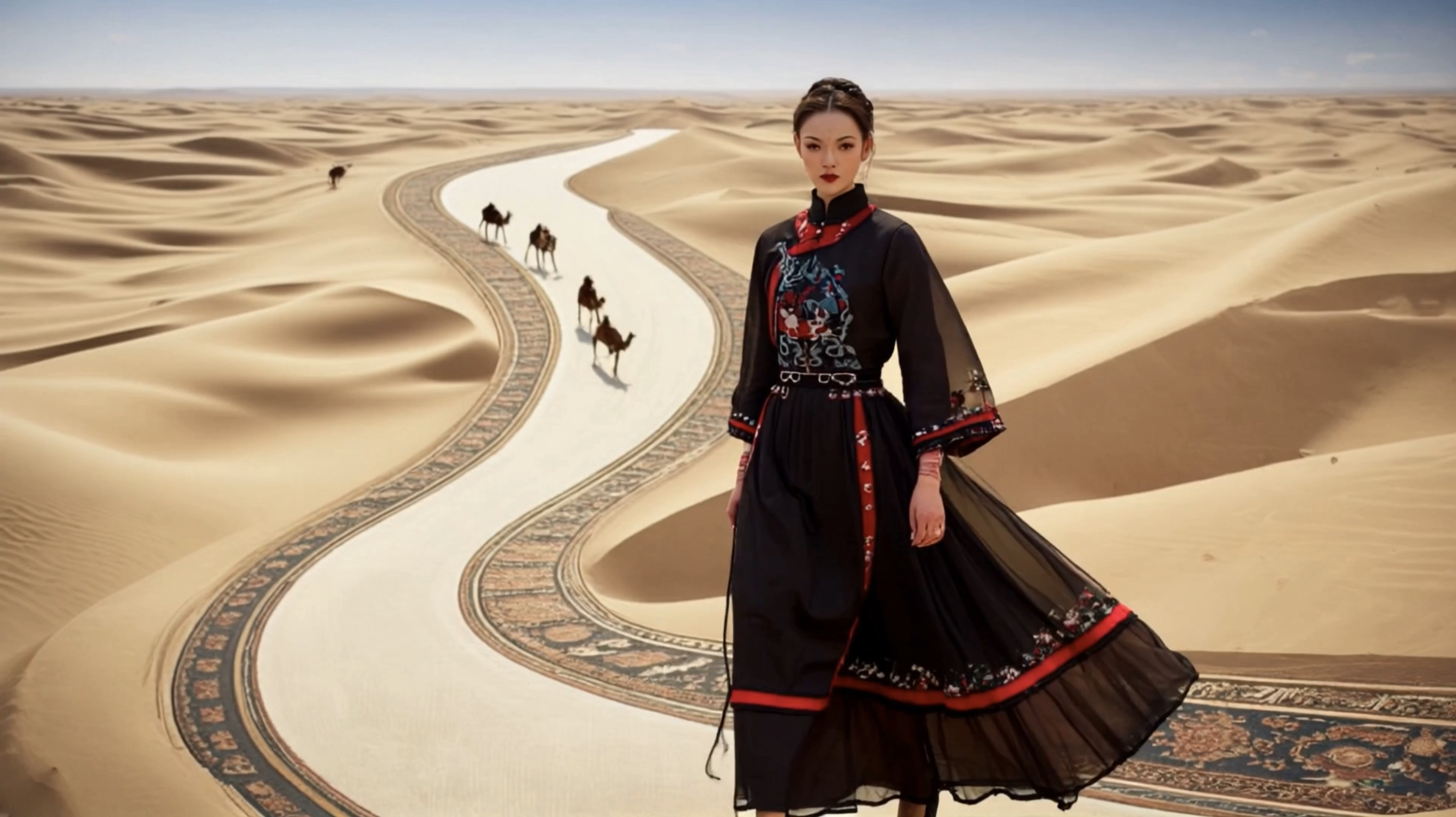 本次虚拟秀场以“溯”为主题,分为“溯源”“溯洄”“溯游”三个系列,分别聚焦文化传承、可持续时尚与现代创意设计,汇聚了119位毕业生的设计作品,集中展示了200余套数字实物成衣,全面展现新一代青年设计师对时尚的理解与实践。本次虚拟时装秀由服装学院师生组成的AI时尚团队以AI生成模型为创作引擎,通过对大量手绘效果图和成衣大片图像数据的训练,精准理解并还原服装的色彩氛围、面料质地和廓形结构,从而生成虚拟动态视频,再由AI艺术学院师生团队进行后期渲染与剪辑,实现了从草图到成衣再到虚拟时尚形象的智能创作,深度结合了现实与虚拟效果交互,呈现了AIGC融入教学改革、跨专业交流等方面的最新成果。
