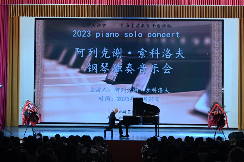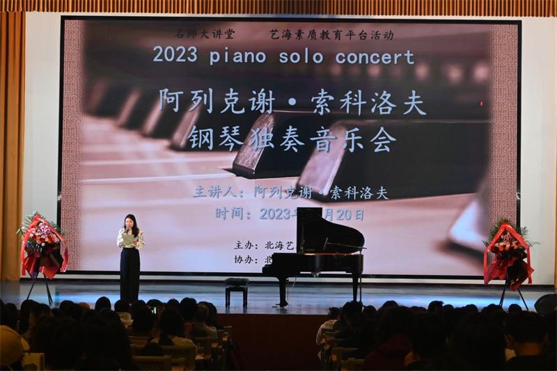 10月20日晚,俄罗斯赫尔岑国立大学阿列克谢•索科洛夫教授于我校西校区大礼堂举办个人钢琴独奏音乐会。北海市键盘学会会长龙康,我校总督学王斌,人文教育学院院长熊秀峰、党总支副书记邓欢、副院长李谦等领导出席音乐会活动。音乐会由人文教育学院艺术教育教研室老师张靖茜主持。