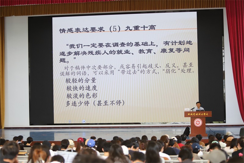 讲座中,付程教授提出情感表达应符合有声语言艺术创作当中准确、鲜明、生动的“六字标准”和无一字无一据、无一语无变化、无一言无对象的“三无境界”。播音员在情感表达中应言之有理、言之有据,不能说空话、讲虚言,并做到情动于衷,有感而发,声情并茂。此外,付程教授还提出“一真二准,三连四变,五控六整,七综八神,九重十高”的创作规律。进一步说明表达感情要真切,情感要连贯流畅,动真心并真动心,以真切体会的感情来展示播音表达。他建议同学们从日常生活的细微处入手,区别播音与日常口语交流,努力提高自身的专业度与播音艺术性。