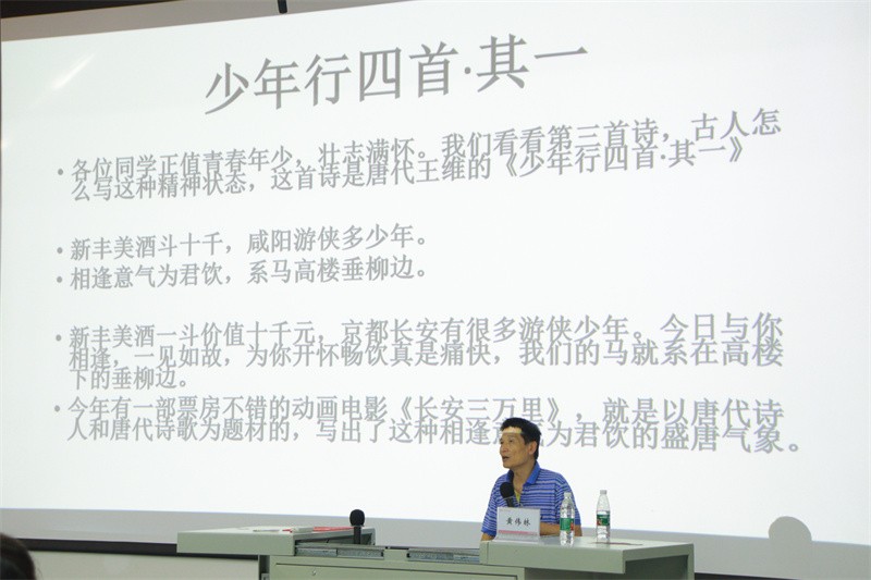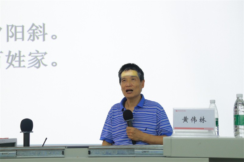 紧接着,黄伟林教授着重分享了诗人艾青的诗歌《我爱这土地》,并分析这首诗歌如此感人的两个原因,其一是诗歌形象生动地表达出中国人潜藏在内心深处的爱国之情,唤醒读者内心的祖国形象,激活了读者内心的深厚爱国之情;其二是诗歌在表层的意象下隐藏了潜意识层面能感知的深层意象。黄伟林教授现场播放该音乐舞蹈,带领现场师生体会诗歌转换成舞蹈艺术的魅力,进而说明文学是艺术创作的重要资源。