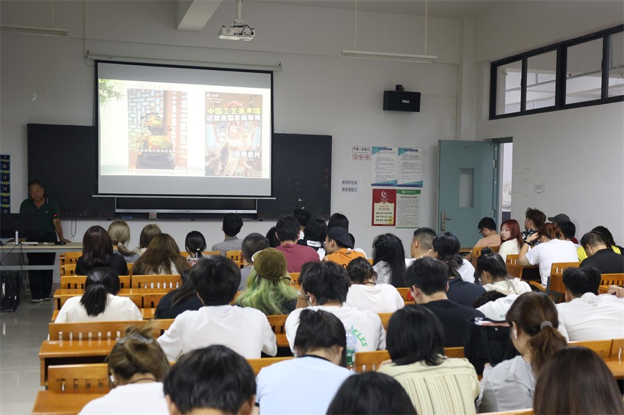 紧接着,白耀华教授从北海、合浦的历史发展背景出发,详细介绍了角雕和贝雕的历史渊源、制作工艺和艺术特色。白耀华教授播放了来自中国工艺美术馆展品的视频,搭配生动的详细讲解和精彩的图片展示,丰富精美的艺术品给现场师生留下了深深的震撼和印象。白耀华教授表示,角雕以其雄浑的气势和精湛的雕刻技艺而著称,巧妙的刀法将坚硬的角质材料雕琢成栩栩如生的艺术品,蕴含着匠人深厚的艺术功底和无尽的创造力;贝雕则是以其细腻的线条和绚丽的色彩而备受瞩目,匠人利用贝壳的天然纹理和色彩,通过精细的切割和镶嵌,创作出一幅幅精美绝伦的作品。