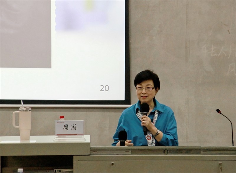 讲座过程中,周游还讲述了改革开放以来伟大祖国的繁荣昌盛,中国广播电视发展辉煌、蒸蒸日上,红色基因也在代代相传。周游表示,作为一名播音员,不仅要具备良好的专业能力和身体素质,还须具有德才兼备的专业素养。她鼓励同学们在专业学习和发展中赓续红色基因,坚定信仰信念,砥砺前行团结奋进,牢记使命践行初心,肩负起时代使命,为祖国和人民贡献自己的力量。