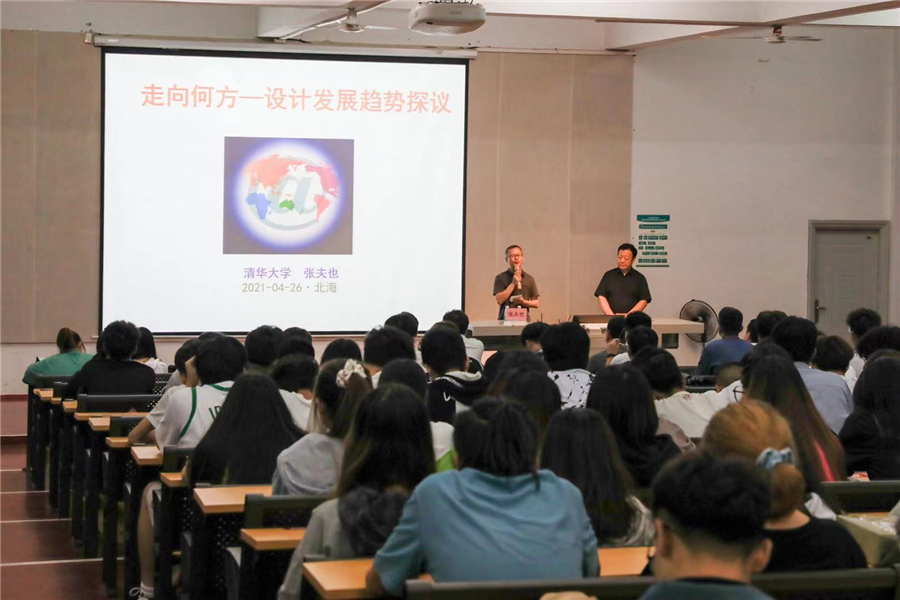 2021年4月26日晚19:30分于我校伦理楼107,教育学院院长张夫也为我校师生带来了一场题为《走向何方—设计发展趋势探议》的讲座。本次讲座由副校长王斌主持。