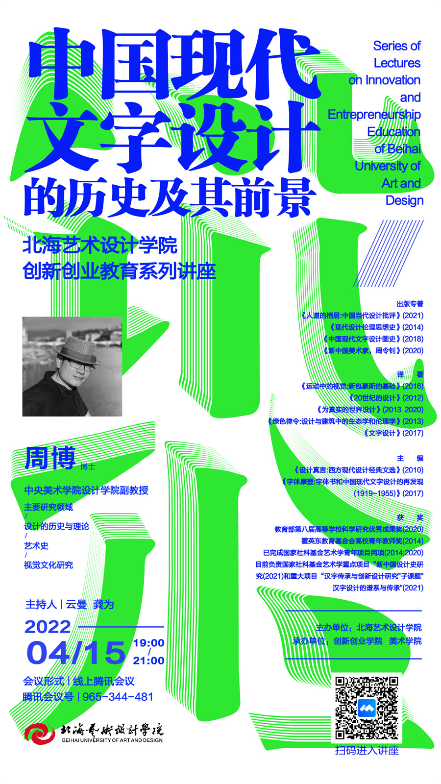 为营造浓厚的创新创业校园文化氛围,学校持续开展创新创业教育系列讲座。4月15日,中央美术学院设计学院副教授周博应邀为我校开展题为“中国现代文字设计的历史及其前景”的线上讲座。讲座由创新创业学院和美术学院共同承办。