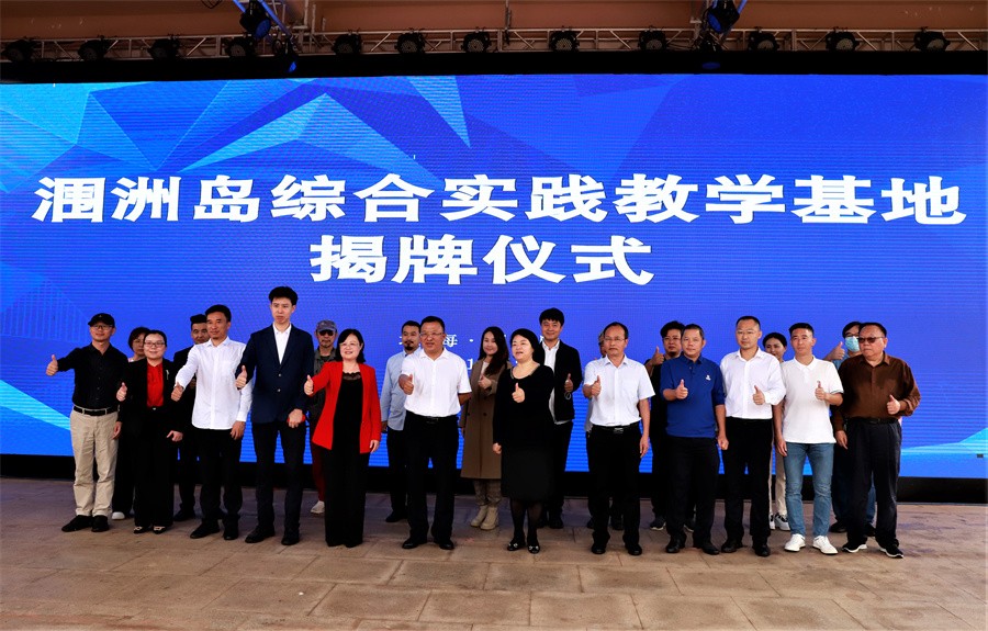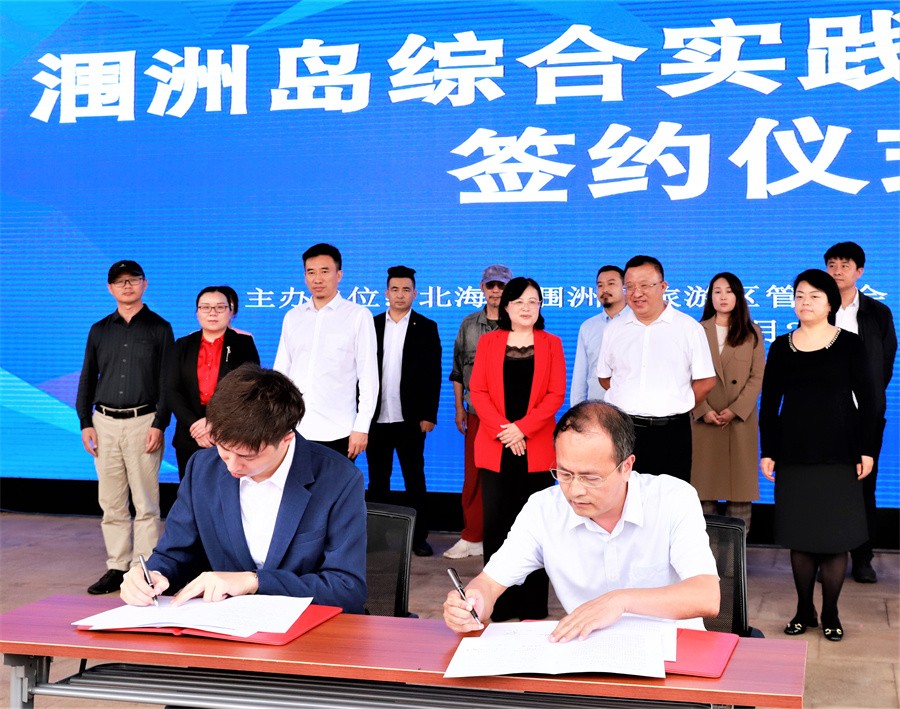 我校董事长郑念贻、涠洲岛旅游区党工委副书记沈振华代表双方进行协议签约,并与张阳、张实四人共同完成揭牌。