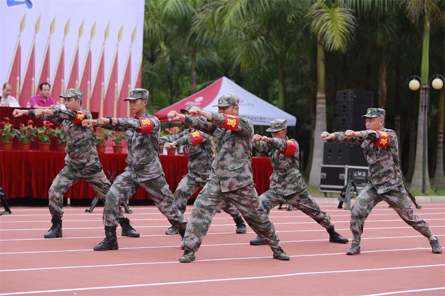 大会上,全体承训教官进行了精彩的军事科目演示,教官队伍整齐划一,步伐矫健,精神饱满,动作规范,赢得现场师生的阵阵掌声。