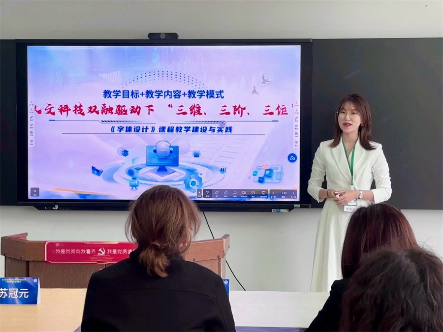 国赛现场答辩中,李欣颐以“在人文科技双融驱动下‘三维、三阶、三位’《字体设计》课程教学建设与实践”为主题,系统展示了课程中融入的AI辅助设计、交互式数字媒体技术等前沿教学手段,并通过学生作品案例生动呈现了教学成果。