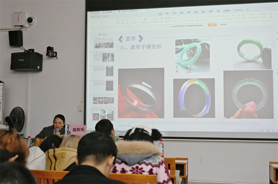 龚辉琼大师以自身25年玉雕行业深耕经历为切入点,分享了与玉雕艺术结缘的初心历程,随后以“翡翠”为核心样本,带领师生深入探索玉石文化的深层魅力。她通过展示早年在云南选材时拍摄的翡翠原石实物照片,清晰阐释翡翠本质属性,并结合行业见闻,客观介绍翡翠文化的历史背景与行业特点。
