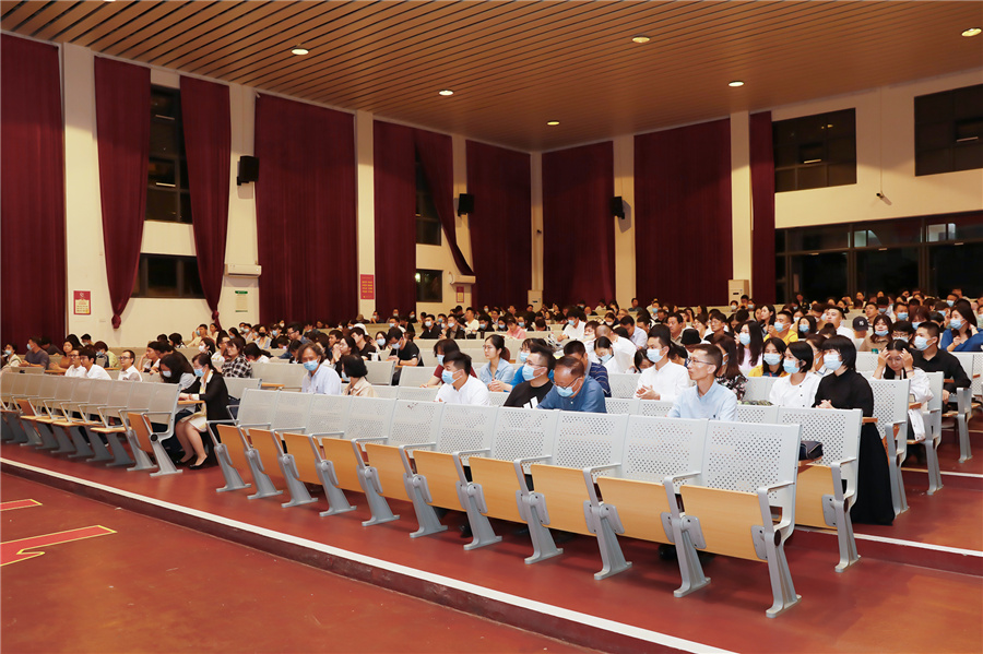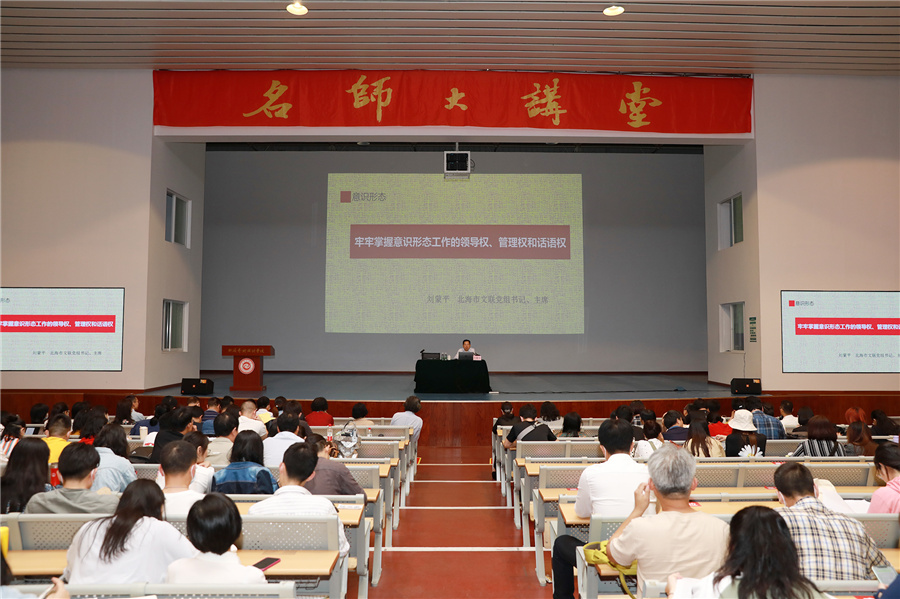 4月28日晚,我校在西校区大礼堂召开2021年意识形态专题培训。北海市文联党组书记、主席刘蒙平应邀到校作题为“牢牢掌握意识形态工作的领导权、管理权、话语权”的专题培训。培训由学校党委副书记韦静月主持。学校全体领导、行政管理人员及教师代表共计400多人参加了本次培训。