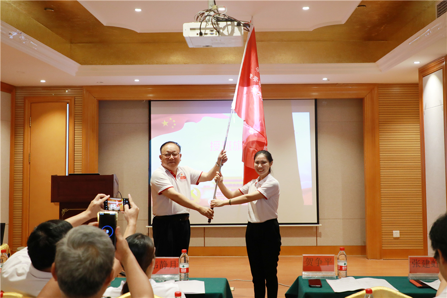 常务副校长贺争平向学习班班长何敏芝同志授班旗
