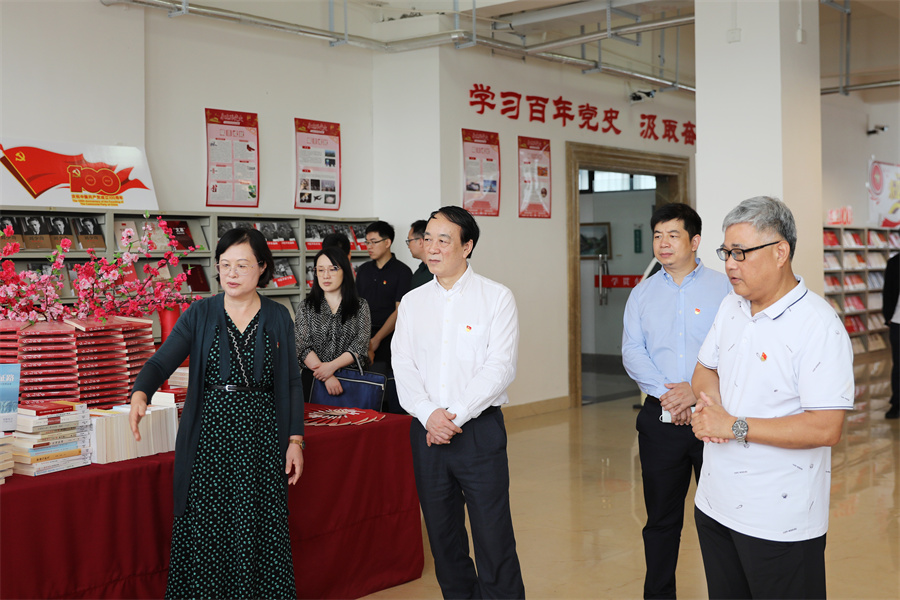 唐安洲一行首先来到西校区伦理楼二楼参观学生节目《黄河》排演,随后到达图书馆分别参观了建筑与环境艺术学院课程思政2019级景观设计专业学习成果《建党百年红色文化景观设计展》、《展示空间设计》课程红色元素模型成果展,以及图书馆党史阅读角、党员政治活动室,观看了反映我校党史学习教育及课程思政教学成果的视频作品《半条被子》《唱给海的歌》《服装专业优秀作品走秀》。