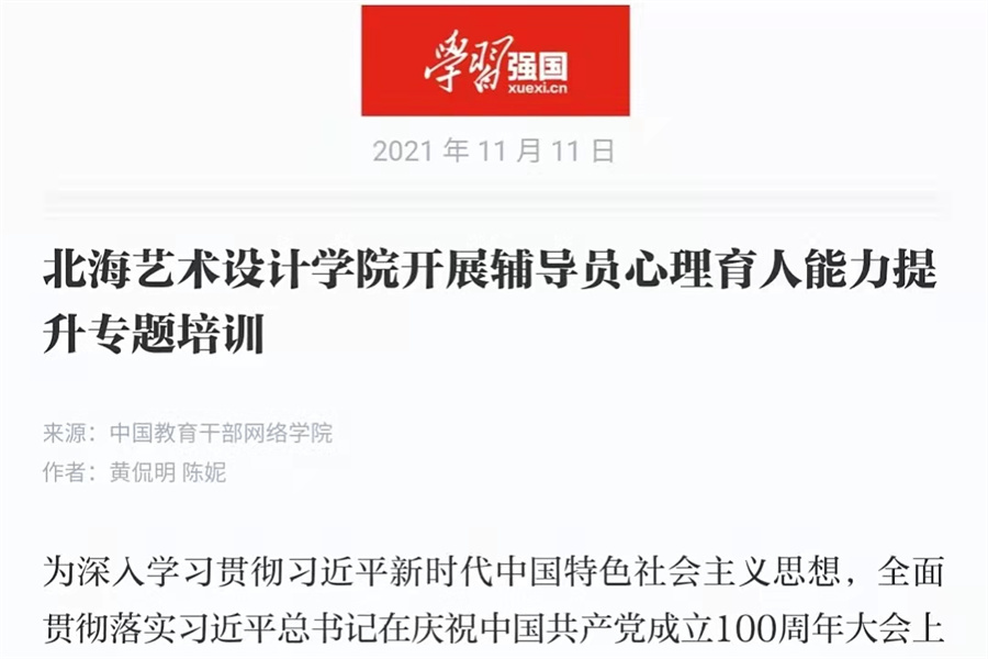 为深入学习贯彻习近平新时代中国特色社会主义思想,全面贯彻落实习近平总书记在庆祝中国共产党成立100周年大会上重要讲话精神,将学习贯彻习近平总书记关于教育的重要论述引向深入,不断提高辅导员的理论水平、职业能力和专业素养,根据教育部等八部门《关于加快构建高校思想政治工作体系的意见》和《普通高等学校辅导员队伍建设规定》等文件要求,北海艺术设计学院开展了辅导员心理育人能力提升专题培训。