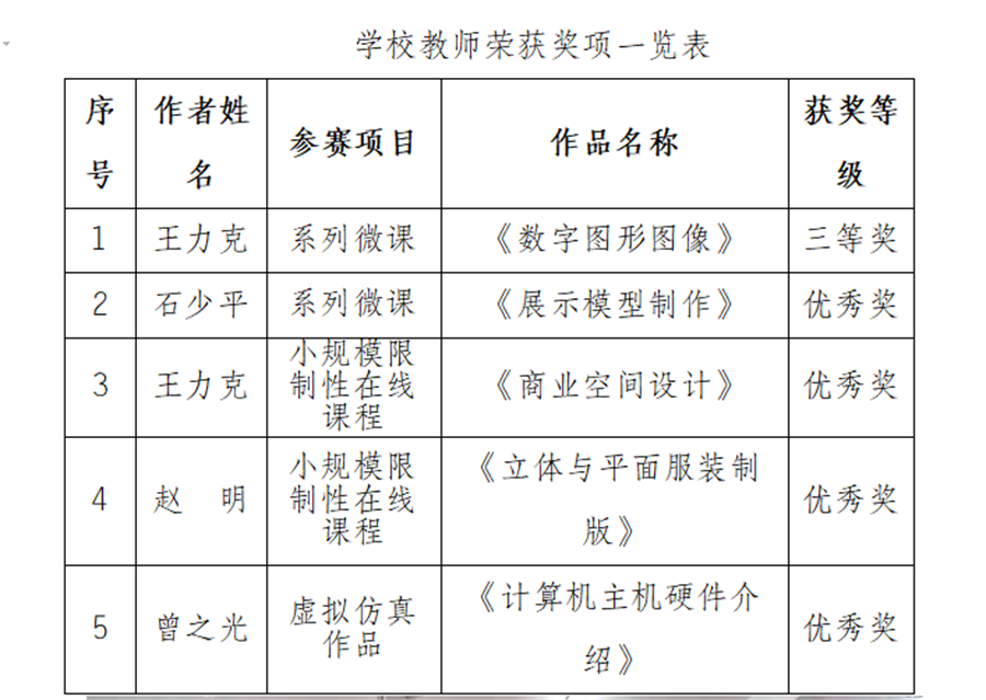 经学校初选、自治区67所高校网络评审层层筛选及决赛评比,我校本次共有五个参赛项目获奖。其中,《数字图形图像》获大赛三等奖,其他参赛作品获优秀奖。