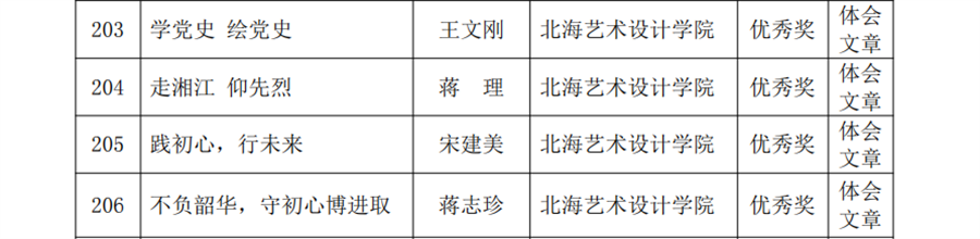 据悉,本次比赛共收到全区69所高校推荐报送作品1097篇。我校教师王文刚的作品《学党史 绘党史》、蒋理的作品《走湘江 仰先烈》、宋建美的作品《践初心,行为来》、蒋志珍的作品《不负韶华,守初心博进取》在逾千篇文章中脱颖而出,荣获大赛优秀奖。