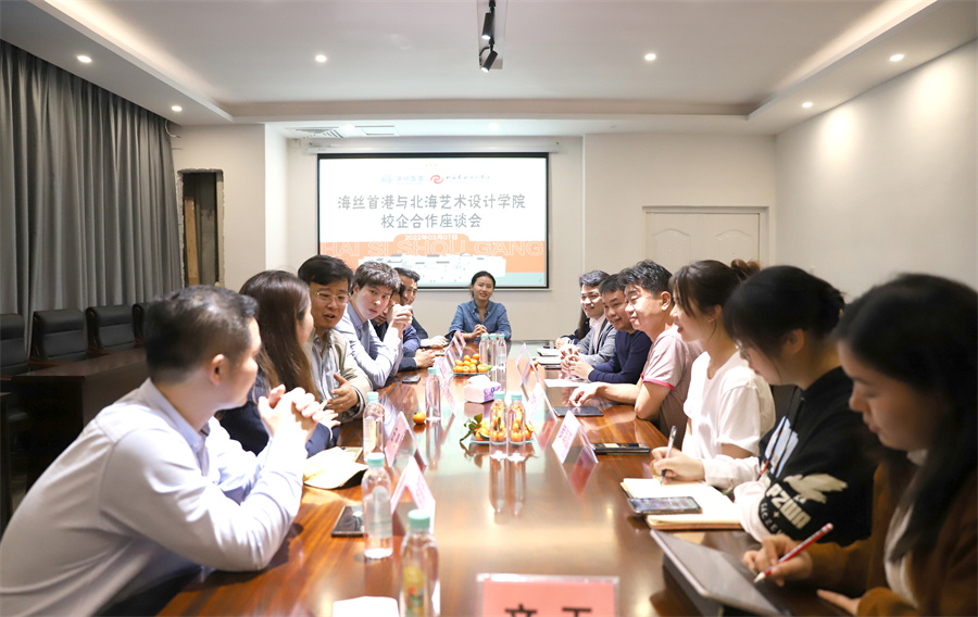 北海市古郡丝路旅游开发有限公司副总经理张广、刘学俭,董事会秘书长兼人资部经理罗海燕及相关负责人,我校动画与传媒学院党总支书记孙永辉、设计艺术学院院长李林平、创新创业学院院长云曼、人文教育学院党总支副书记邓欢、教务处副处长武鹏程、科研处副处长蒋辉平一同参与了座谈交流会。