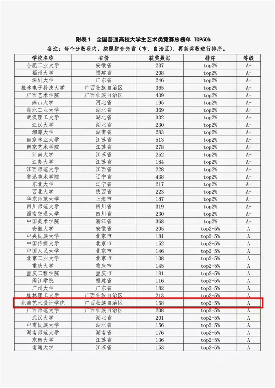 近日,中国高等教育学会“高校竞赛评估与管理体系研究”专家工作组对艺术类竞赛指数进行分析发布。在首轮艺术类竞赛指数覆盖的1098所本科院校中,北海艺术设计学院以获奖数158项、等级A、位居参评本科高校排名前33、名列全国民办艺术类高校第二,充分展示了学校师生的高阶专业能力和艺术创新水平。