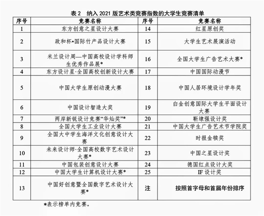 纳入2021版艺术类竞赛指数的大学生竞赛清单