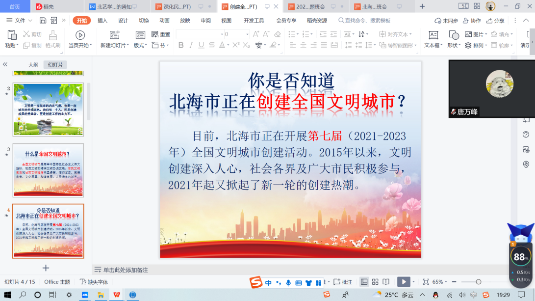 本次班会介绍了北海市创建全国文明城市,共建文明校园的美好蓝图,让学生深刻的认识到创建文明城市的重要性和对自身于社会的责任,规范学生的意识和行为,提升自己的社会认同感,增强学生的集体意识和社会共同体意识。(张洁妮 摄)