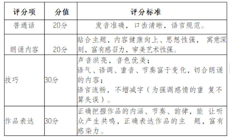 备注:朗诵内容时长控制在5~5分钟之内,现场超时或不足,或现场未脱稿,均属于扣分项,扣分标准以现场评委商定结果为准。