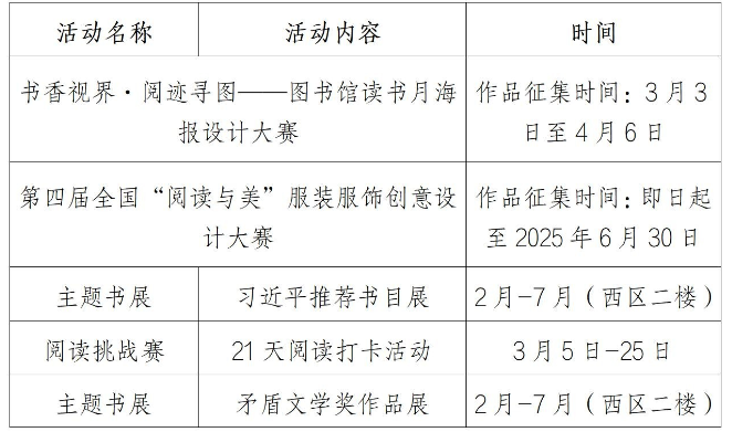 为深入贯彻落实党的二十大精神,贯彻落实习近平总书记关于推进全民阅读、建设书香社会等重要指示精神,深入实施“时代新人铸魂工程”,不断推进校风、学风建设,营造浓厚的书香校园氛围,在第30个“世界读书日”来临之际,图书馆决定开展“阅享经典传承文明”主题系列活动, 通告如下: