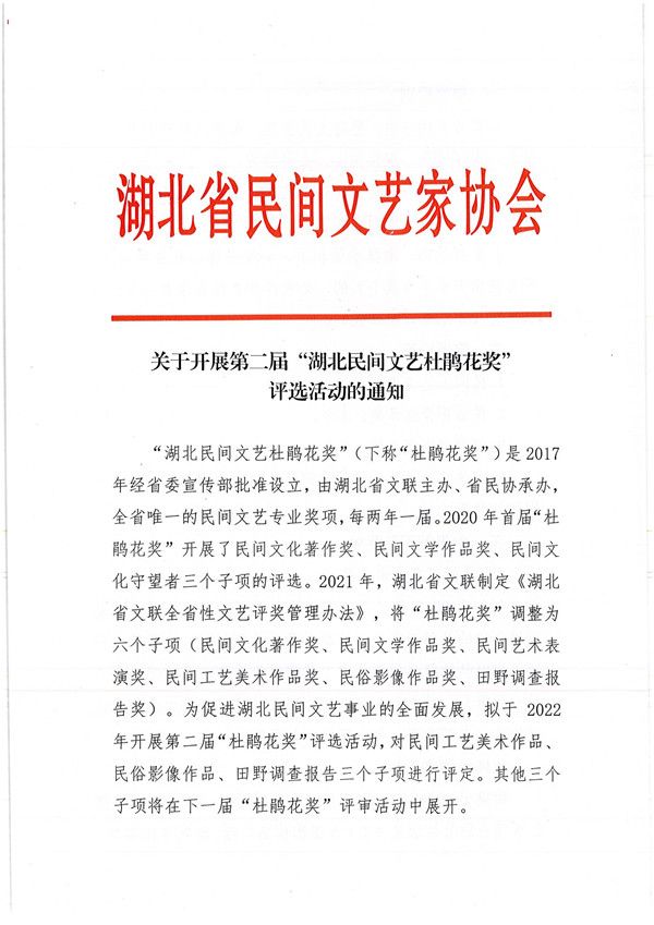 关于开展第二届“湖北民间文艺杜鹃花奖”评选活动的通知