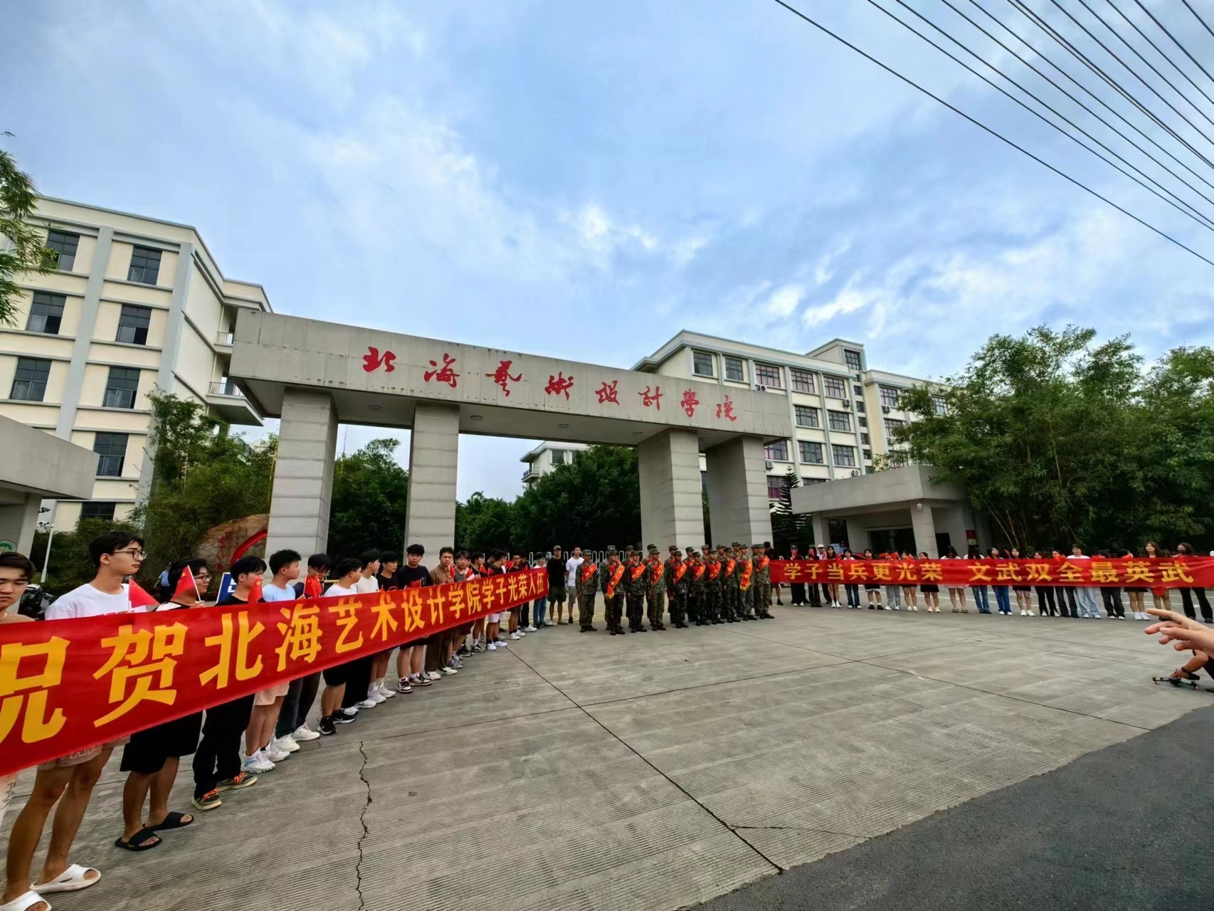 “学子当兵更光荣,文武双全最英武”。9月15日,北海艺术设计学院为光荣入伍的学生举行欢送仪式。美术学院有三名学生投身军营,光荣入伍。他们分别是绘画1901徐浩东、书法2201腾猛、书法2202田光磊。
