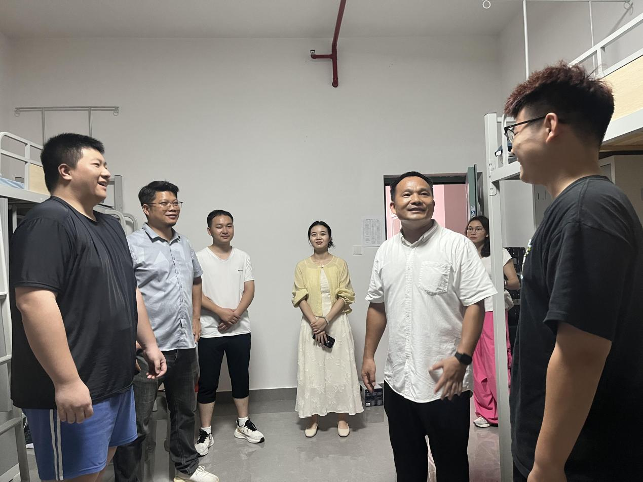 在走访过程中,领导老师们逐一走进新生宿舍,仔细查看宿舍的住宿环境、设施配备及安全情况,详细询问新生们的报到入住、饮食适应、行李安置等情况,叮嘱大家注意用电安全、保管好个人财物,尽快熟悉校园环境。