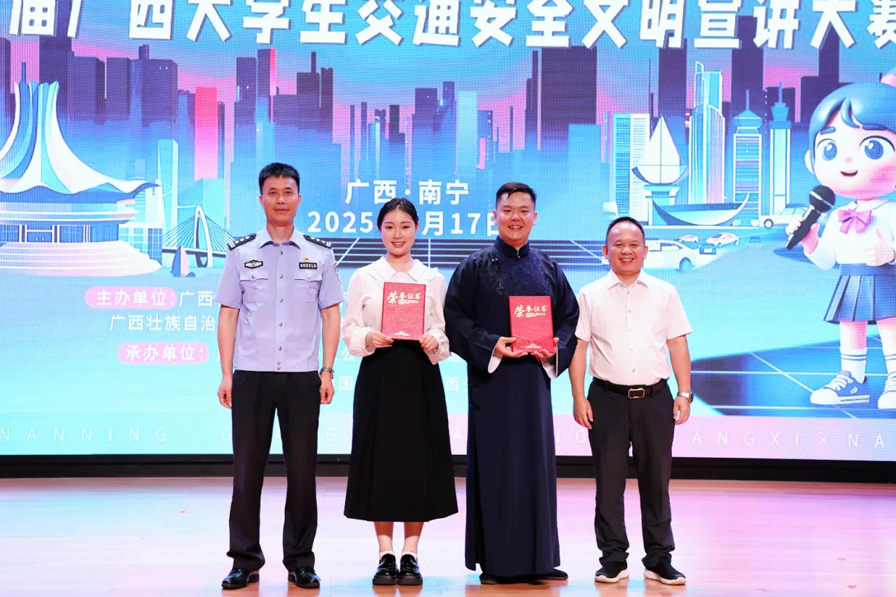 近日,由自治区公安厅、文明办、教育厅、共青团广西区委联合主办的第二届广西大学生交通安全文明宣讲大赛结果发布,我校张丽君、唐良春老师带队的参赛团队凭借出色表现荣获广西赛区一等奖,展现了学校在交通安全教育与安全宣讲领域的创新能力与教学水平。