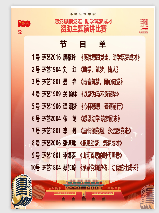 2021年4月22日19时30分,环境艺术学院“感党恩跟党走,助学筑梦成才”资助主题演讲比赛于伦理楼L-107顺利开展,出席本次赛事的领导嘉宾有:北海艺术设计学院资助中心主任、学生工作部部长、学工处副处长班媚,北海艺术设计学院心理健康教育中心主任、学工处副处长刘玲花,北海艺术设计学院校团委书记唐良春,环境艺术学院常务副院长王照伟,环境艺术学院副院长唐道明,环境艺术学院副院长蔡世伟,环境艺术学院学工办公室主任曲玥,环境艺术学院技能教研室副主任徐子茵,环境艺术学院分团委副书记雷勇,环境艺术学院辅导员马芬。