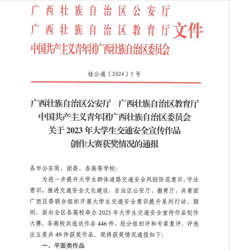 据悉,本次大赛由自治区公安厅、教育厅、共青团广西区委联合组织,旨在增强大学生道路交通安全宣传教育工作的针对性、实效性,着力提升大学生群体的道路交通安全风险防范意识、守法意识,推进交通安全文化建设工作。期间,面向全区各高校举办2023年大学生交通安全宣传作品创作大赛。各高校共选送作品446件,经分组初评和专家复评,评选出五类共49件获奖作品。