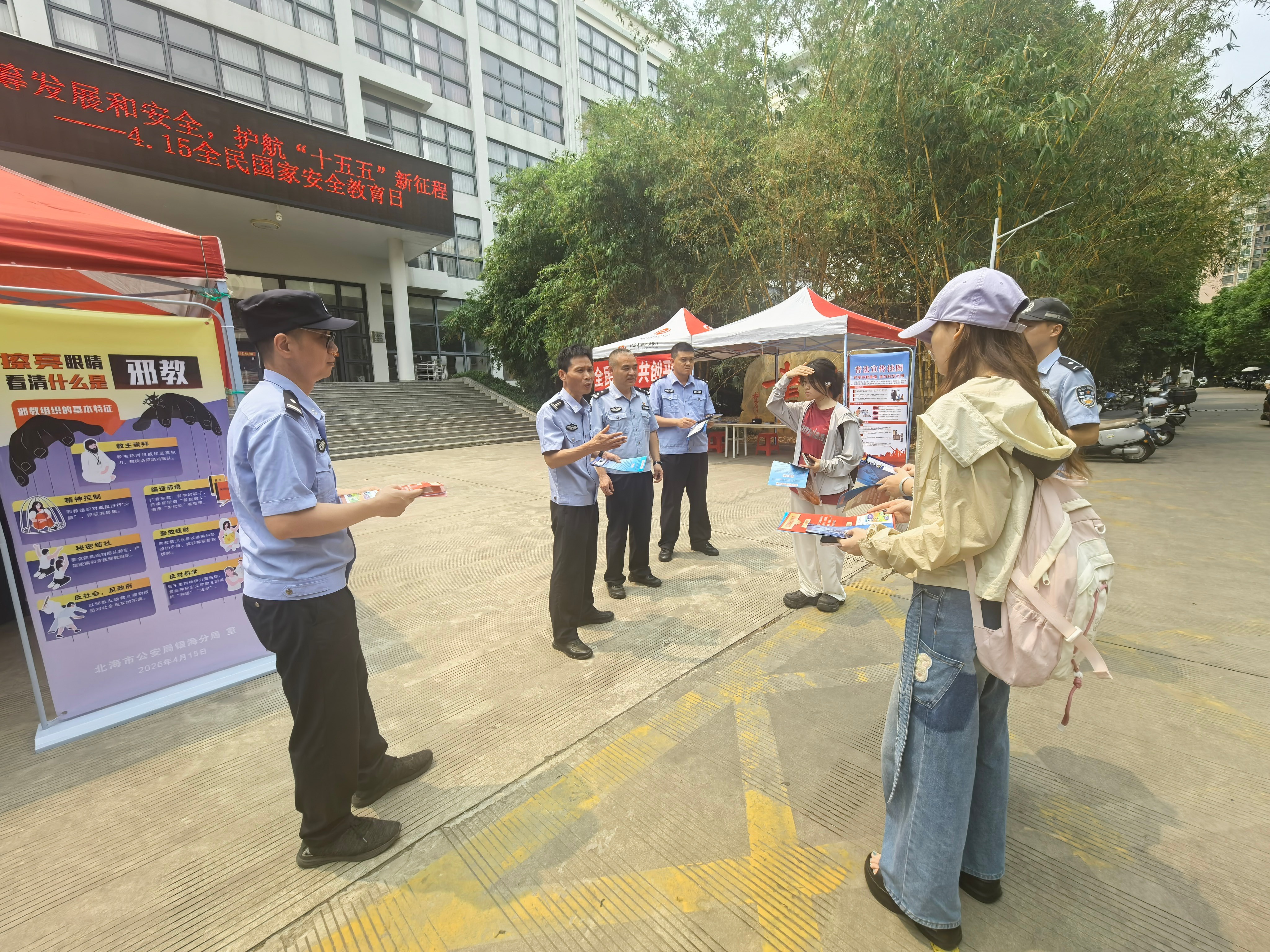 2026年4月15日,是第11个全民国家安全教育日,今年的主题是“统筹发展和安全 护航‘十五五’新征程”。为深入贯彻总体国家安全观,切实增强大学生国家安全意识与法治意识。4月15日上午,我校邀请北海市公安局银海分局政保大队、反恐大队和银滩中区派出所,在我校西校区图书馆前为广大师生开展普法宣传活动。