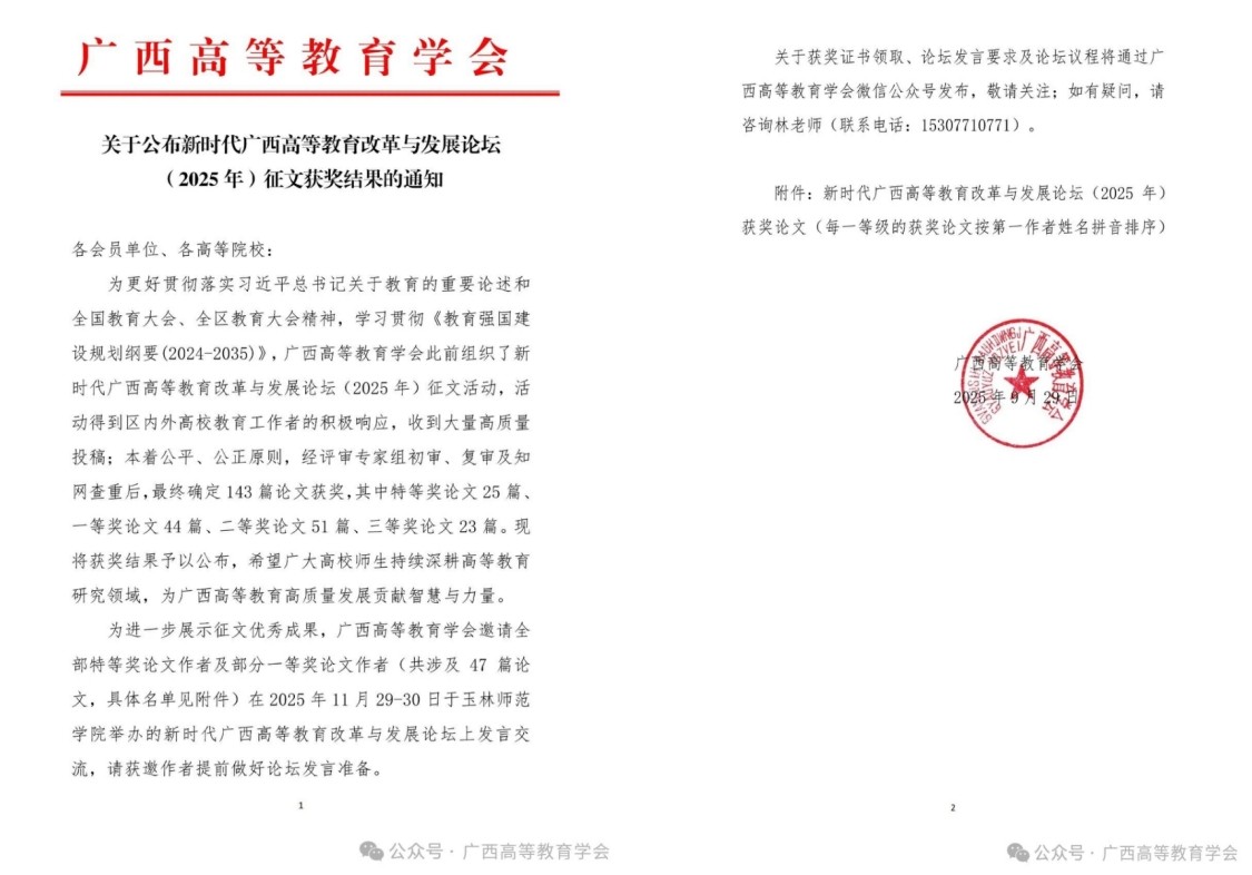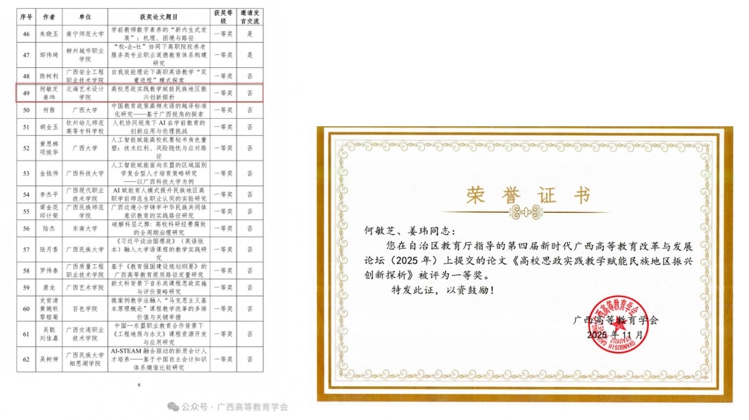 近日,从第四届新时代广西高等教育改革与发展论坛(2025年)传来喜讯,我校何敏芝、姜玮两位老师合作撰写的论文《高校思政实践教学赋能民族地区振兴创新探析》在论坛评选中荣获一等奖。