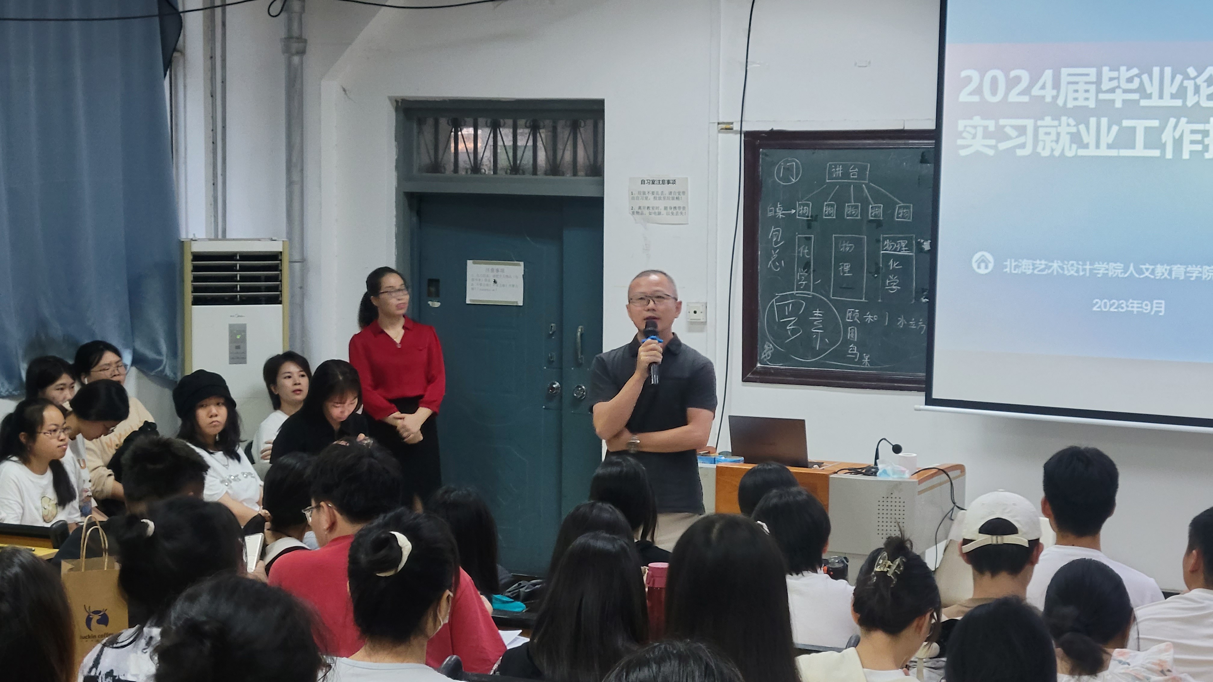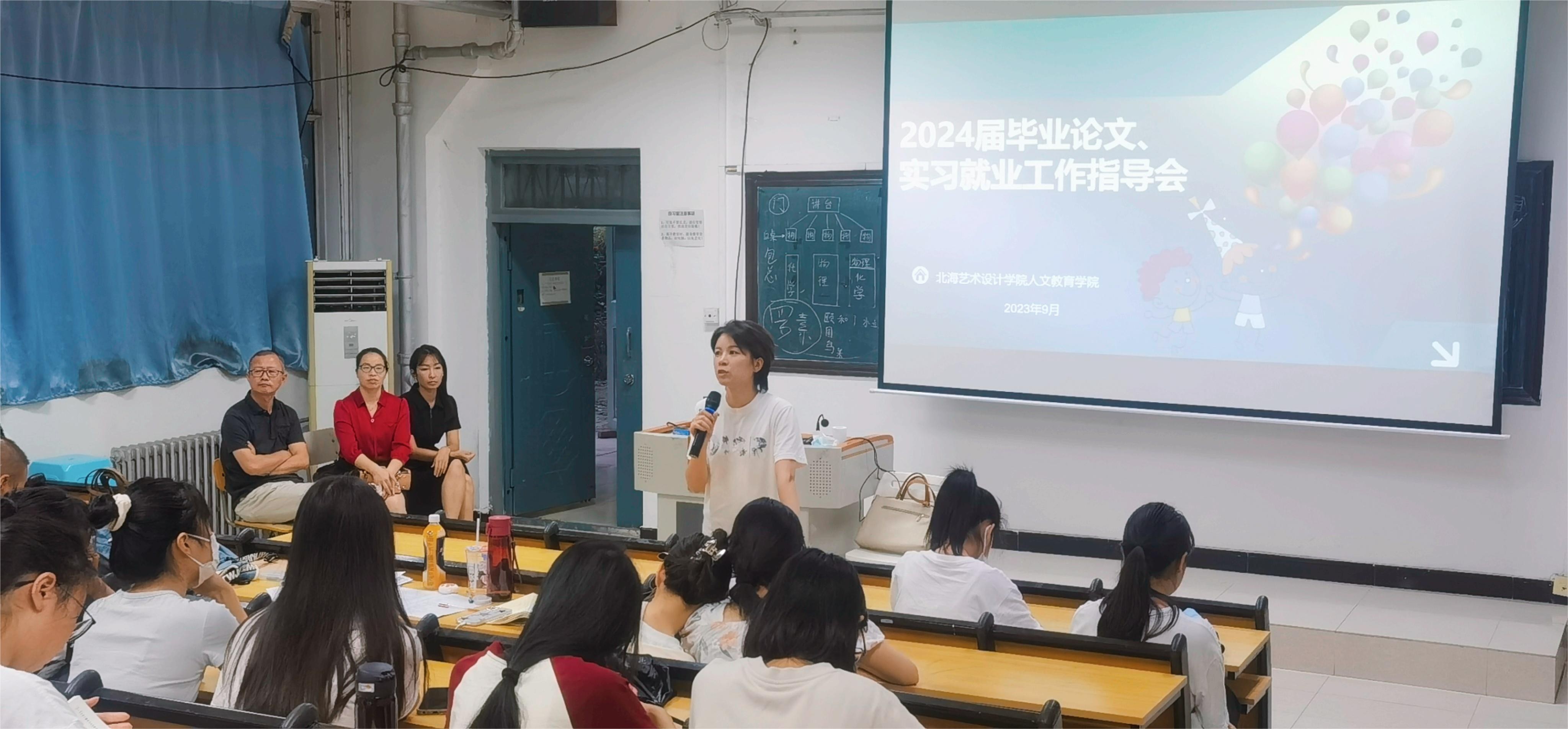 为切实做好我院2024届本科生论文指导、毕业实习就业工作调动学生毕业论文写作、实习与就业的积极性,9月14日,我院召开2024届毕业论文、实习就业工作动员大。北海艺术设计学院总督学王斌、人文教育学院院长熊秀峰、副院长梁镨文出席此次动员会,人文教育学院2024届全体毕业生参加本次动员大会。会议由学院梁镨文副院长主持。