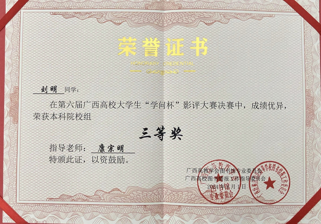 所谓台上一分钟,台下十年功,刘明同学此次在影评大赛中的出色表现离不开他平日爱读书、爱思考、爱提问的好习惯,这使他拥有较强的思辨能力和批判精神。在本次影评中,他也表现了自己擅长把文艺问题与现实问题、历史问题联系起来思考的思维特点。广西高校大学生“学问杯”影评大赛每年均会举办,期望在今后的比赛中,我院同学能够取得更加优异的成绩。