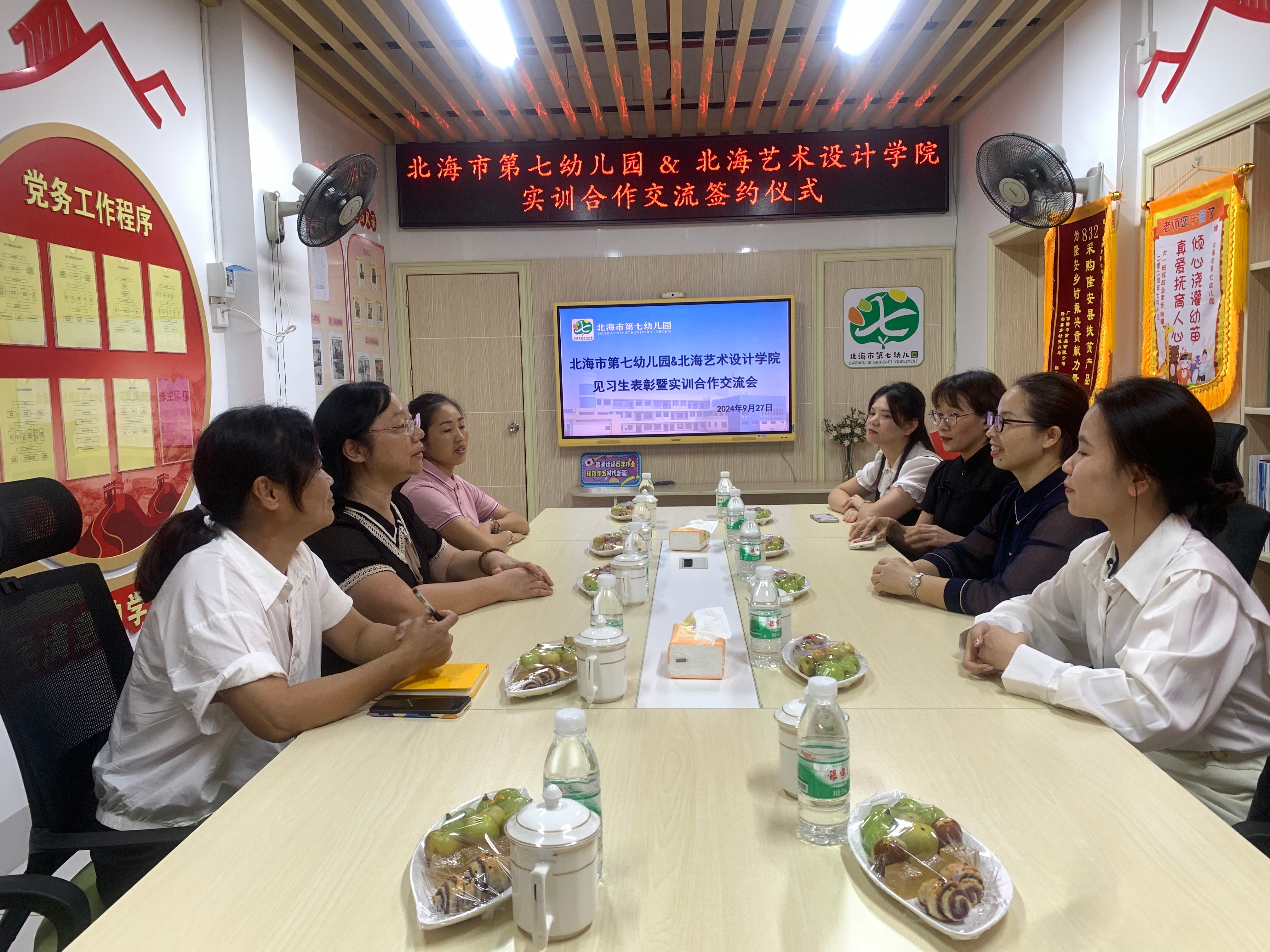 2024年9月27日,北海艺术设计学院教育学院与北海市第七幼儿园实训合作交流暨实践基地签约授牌仪式在北海市第七幼儿园启动。教育学院院长熊秀峰、实验室主任冯小霞、教务办主任黄海林、学前教育教研室主任覃思、市第七幼儿园党支部书记、园长张铮、副园长张均霞、办公室副主任邹华婷等出席仪式。基于“资源共享,优势互补”的思想指导下,贯彻落实我院OBE人才培训理念,深化产教融合,有效推进教学和科研工作的深度合作与交流,实现协同育人,提升高素质复合应用型人才培养质量。