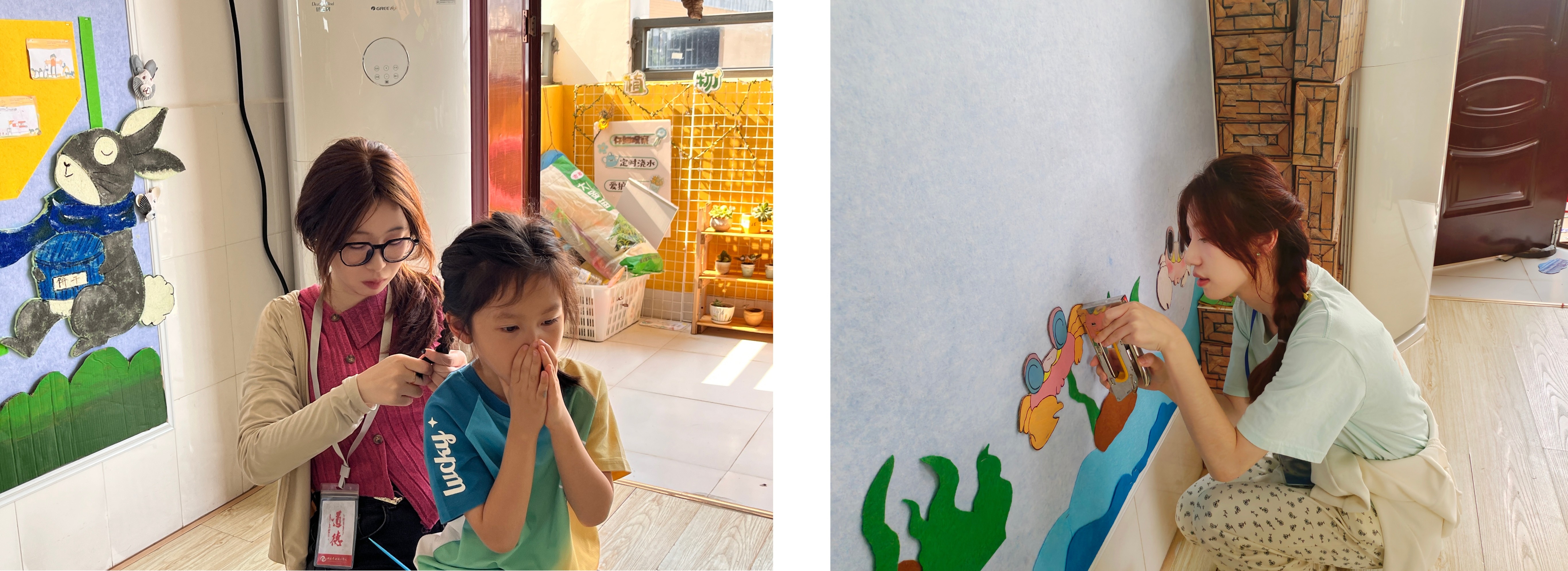 学前2301班陈楚翌帮幼儿扎头发                学前2301班郑小熠参与幼儿园环创