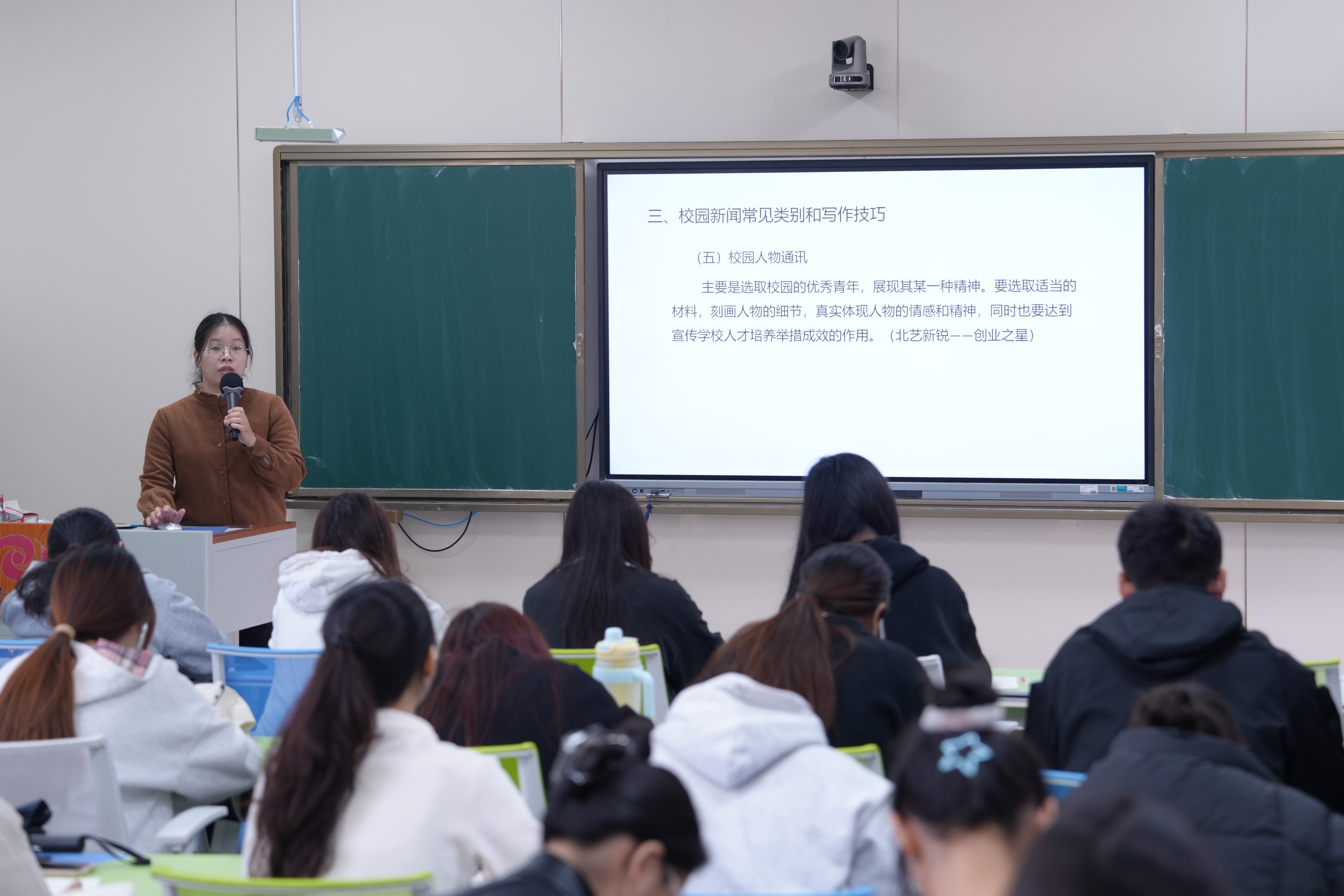 第一节培训课程,哲学学院谢佩玲老师以“校园新闻写作技巧”为主题开展授课。谢老师引导学员从新闻的基本定义、核心要素以及规范结构等方面,对新闻展开系统的认知,并结合新闻报道案例,讲解校园中常见新闻类别的写作技巧,帮助同学们深入了解了校园新闻写作的相关要求。
